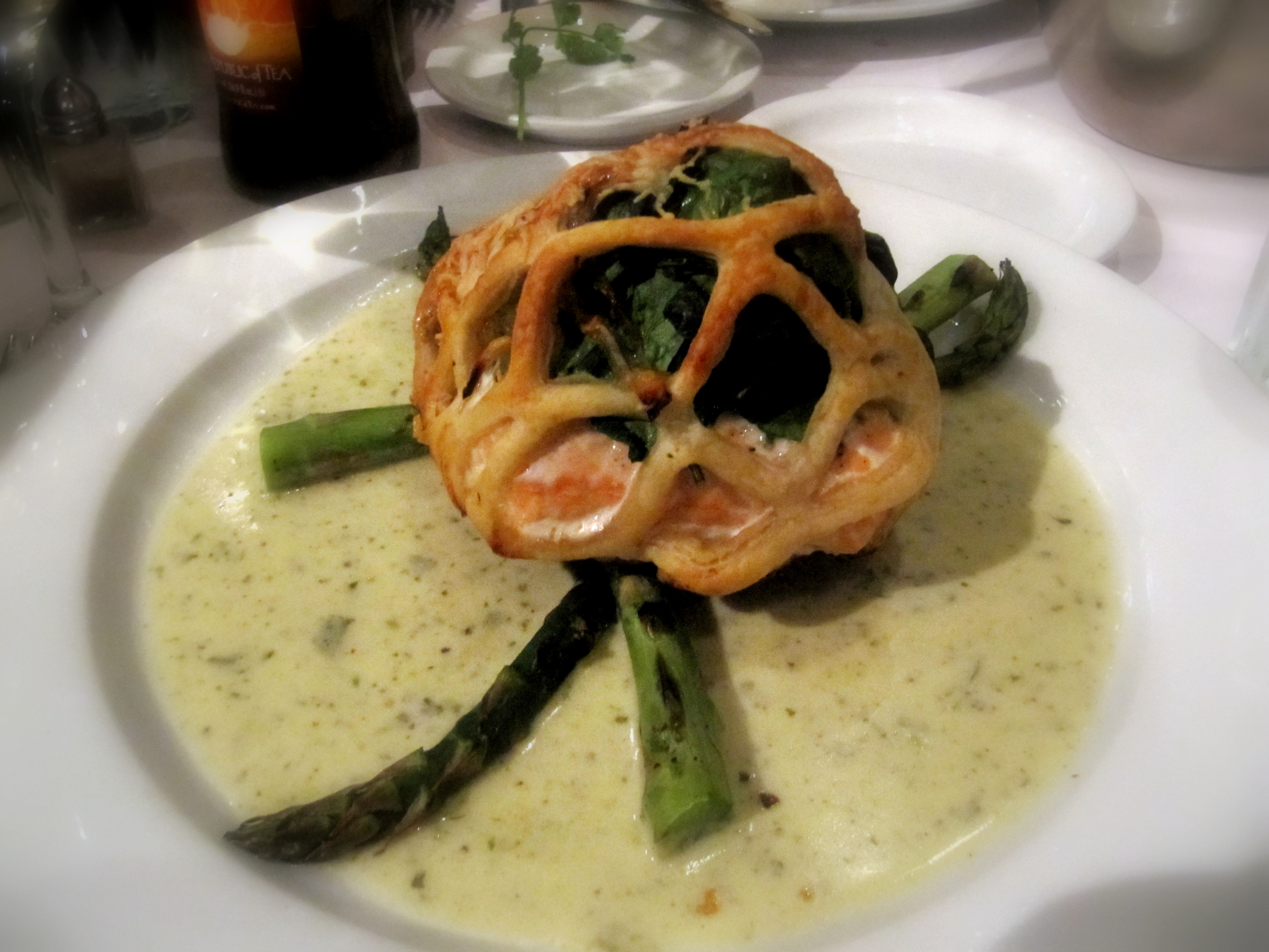 Here is a picture of their famous salmon wellington. Puff pastry wrapped salmon (a HUGE piece) with spinach, mushroom, and onion. Set on top of grilled asparagus and a pool of herb beur blanc sauce. Very unique presentation. It was perfectly cooked and I actually ate the whole thing, plus our calamari appetizer, which was very delicious and tender as well.