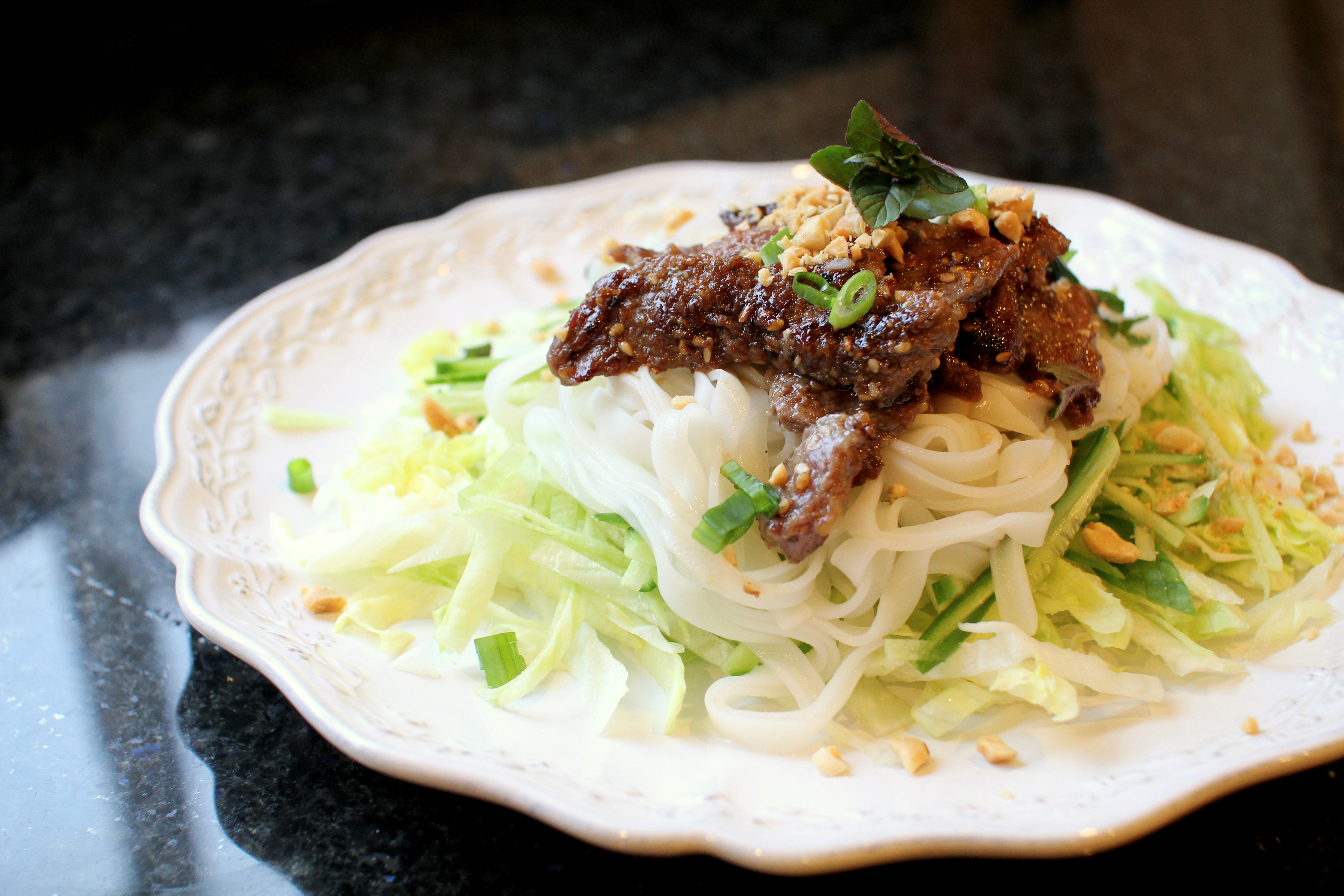 I am still lucky enough to have a few days off for “Spring Break”. One of my goal during this week is to cook something new. Last week at the grocery store, I came across some Thai styled rice sticks, or Vietnamese Banh Pho, so I thought it’d be great to make Pad Thai or a Vietnamese noodle salad dish with lots of fish sauce, both are dishes I haven’t made before. Yesterday after spending 3 hours in the garden in a lovely 70-degrees Spring weather, I was really craving a nice bowl of refreshing noodle salad, with some grilled meat on top. I was yearning for that sizzle on the grill. Is it summer yet?