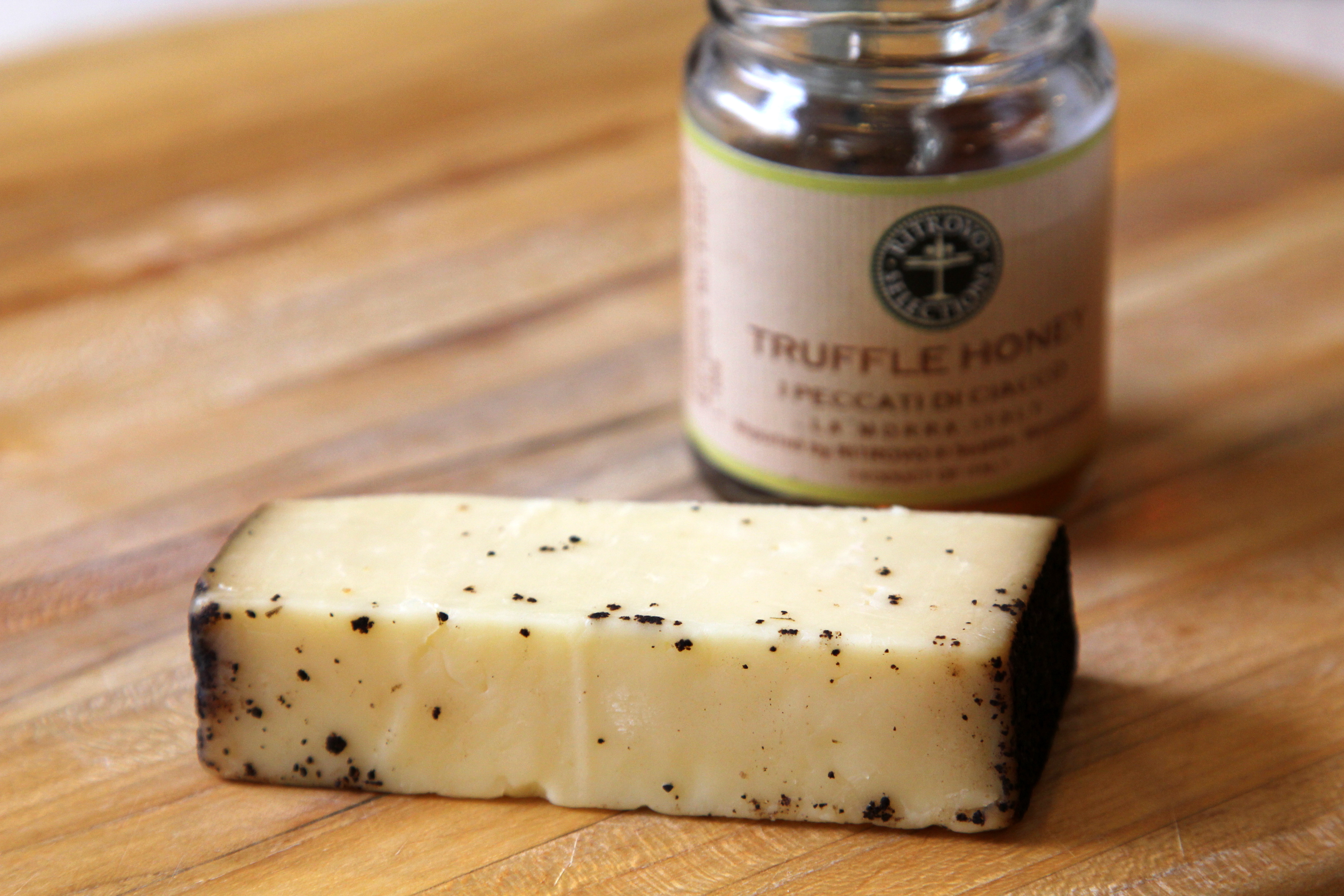 Aged cheddar rubbed with coffee and lavender. Weird combination, no? But somehow it works! It’s a complex flavor yet not overwhelming. Rich, nutty, and just a slight hint of sweetness from the lavender. It goes perfectly with a small drizzle of truffle honey, and some buttery crackers. Takes the boring “cheese and cracker” to a whole new level, doesn’t it?