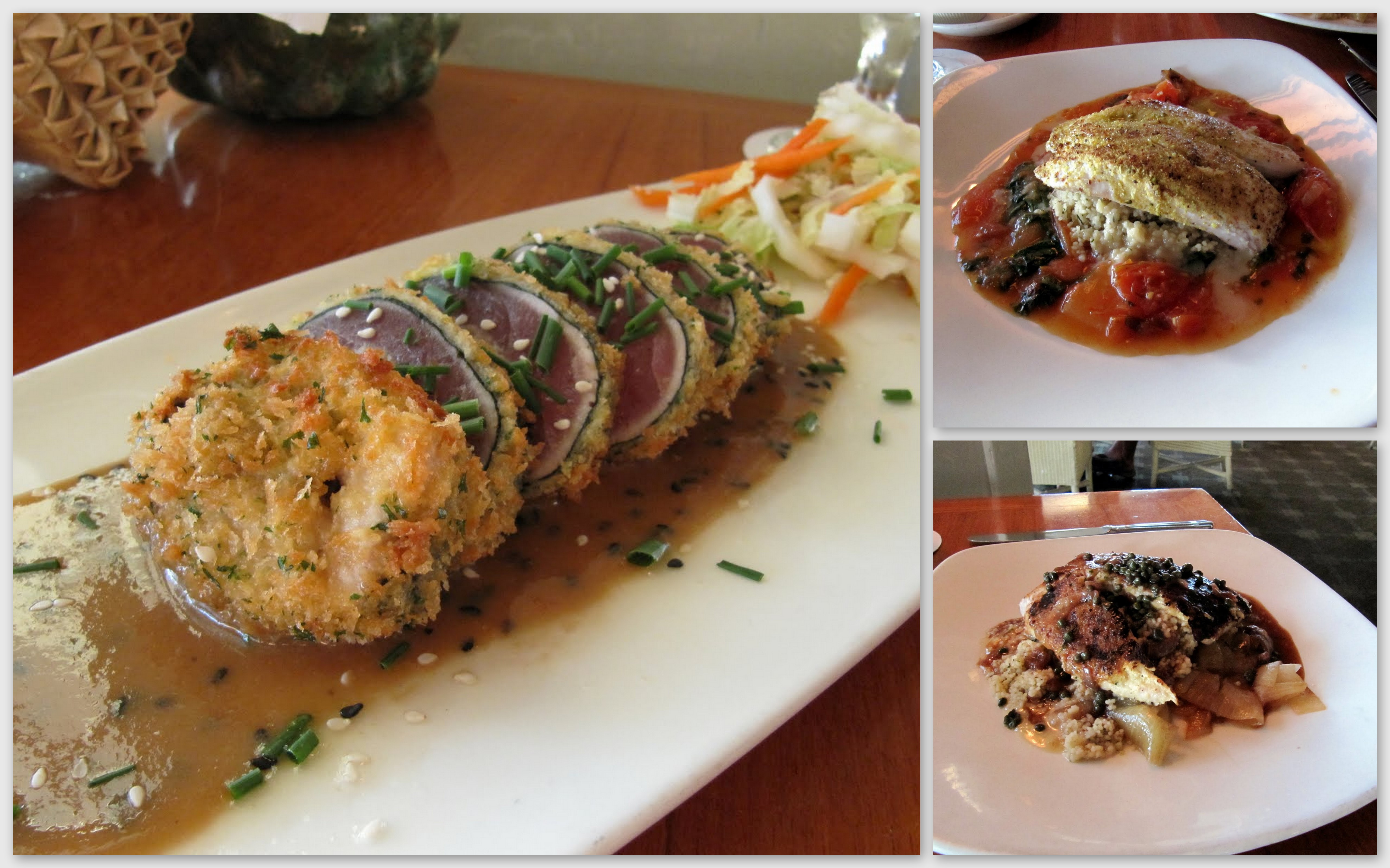 {At the gorgeous and elegant Plantation House Restaurant, located inside the clubhouse of the Plantation Golf Course in Kapalua. Left: Crispy Ahi Stuffed with Crab. Top Right: The Ono, Maui Style: Pistachio-Crusted, Maui Onion, Maui Tomatoes with Cousous. Bottom Right: The Papillote, Mediterranean Style: Maui Onion, Mustard-Crusted, Roasted Onion and Fried Capers.}