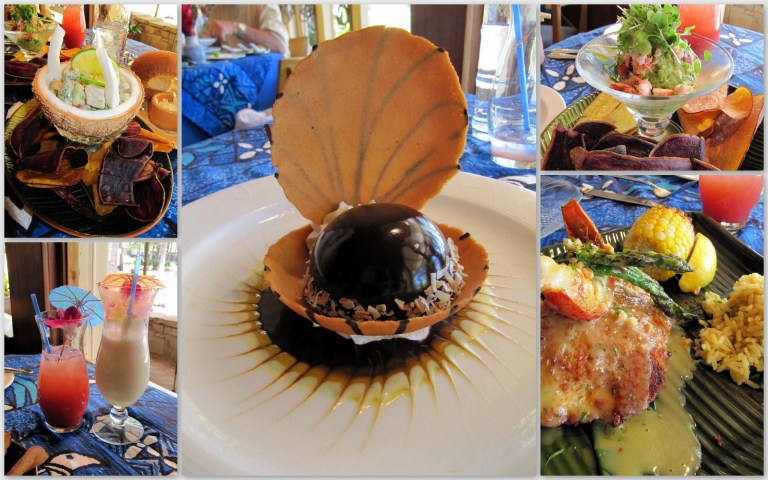 {at Mama’s Fish House in Paia. Top Left: Ahi Poke Tahitian Style. Bottom Left: Strawberry Guava Fizz, Passionfruit Colada. Middle: the Black Pearl dessert. Top Right: Lobster Guacamole. Bottom Right: Macadamia Nut Encrusted Mahi Mahi, Stuffed with Lobster and Crab.}