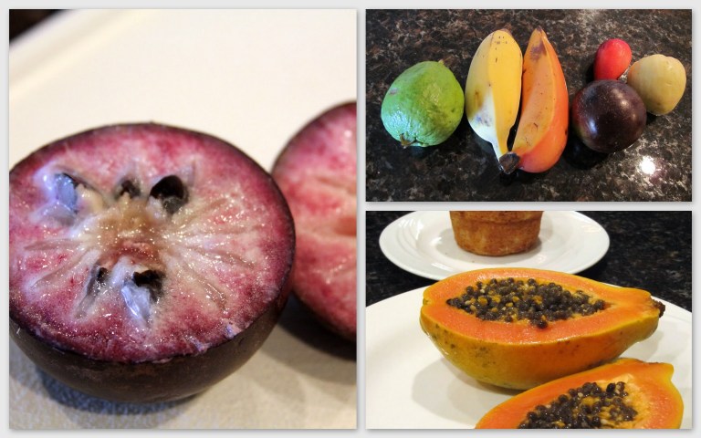 {some interesting finds at the local market. On the left, a star apple. Isn’t it pretty? It was so tasty too. Custardy but still a refreshing taste. On the top right, Guava, Ice Cream Banana, Red Cuban Banana, Star Apple, Red and White Mountain Apples. On the bottom right, a sweet Maui Papaya. }