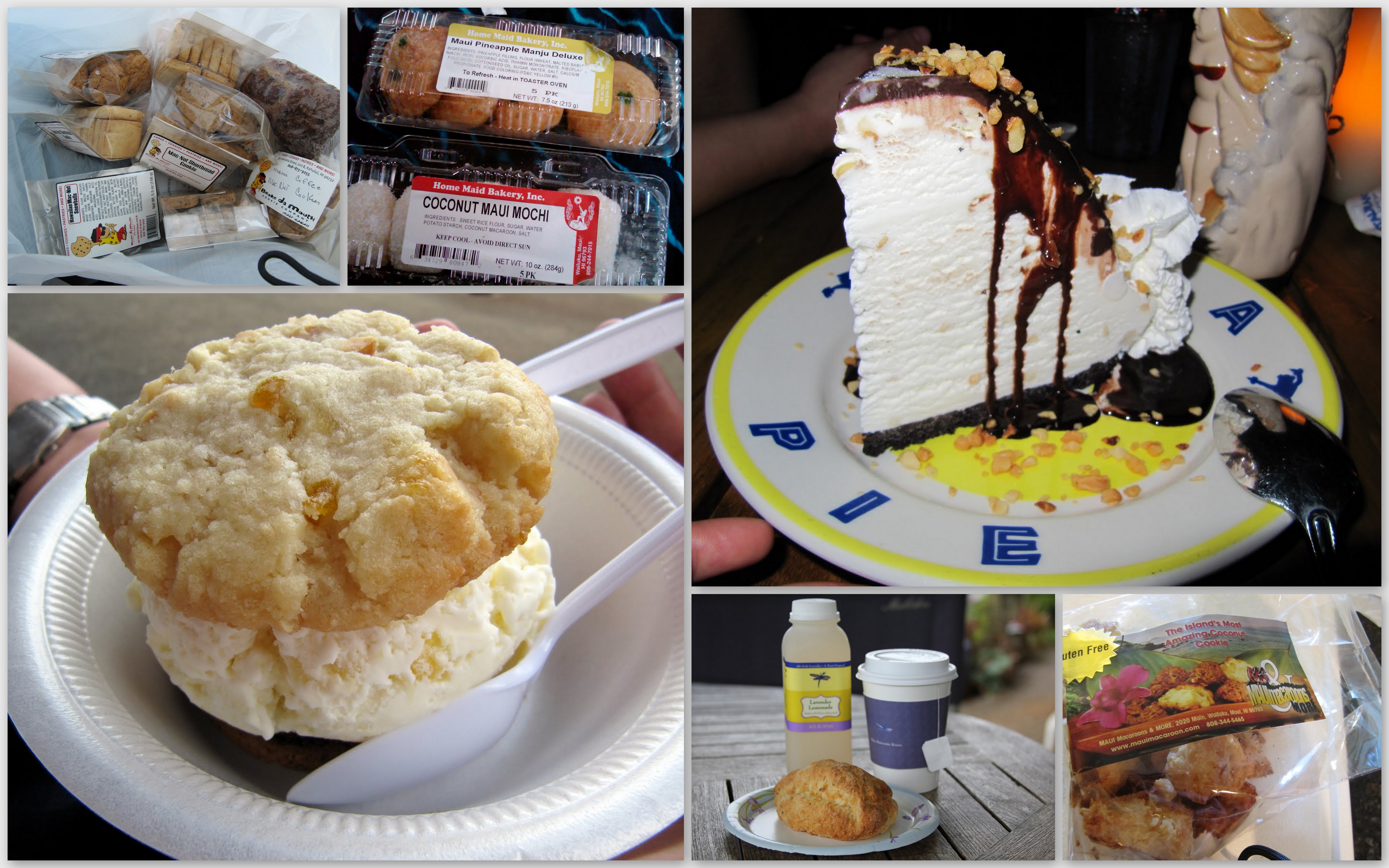 {Some delicious sweets that we had. Left Page, Top-Bottom: Dangerously addicting shortbread cookies from Broke Da Mouth Cookie Co in Kahului. Delicious and crispy Pineapple Manju & Coconut Mochi from Home Maid Bakery in Kahului. Make your own flavor combo ice cream cookie sandwich at Hula Cookies and Ice Cream in Ma’alaea. Right Page, Top-Bottom: Hula Pie (oreo cookie crust, macadamia nut ice cream, homemade fudge) at the Duke’s Beach House in Ka’anapali. Lavender lemonade, lavender tea, and lavender scone at Ali’i Kula Lavender Farm in Kula. The best coconut macaroons! – Maui Macaroons at the Maui Swap Meet}