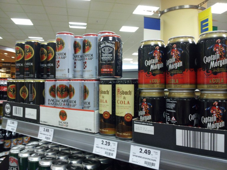 While I’ve never seen these in any stores in the States before, I spotted a whole aisle of them in a German supermarket. Bacardi, Captain Morgan, Jack Daniels…There were quite a few other combinations as well. Pretty cool!