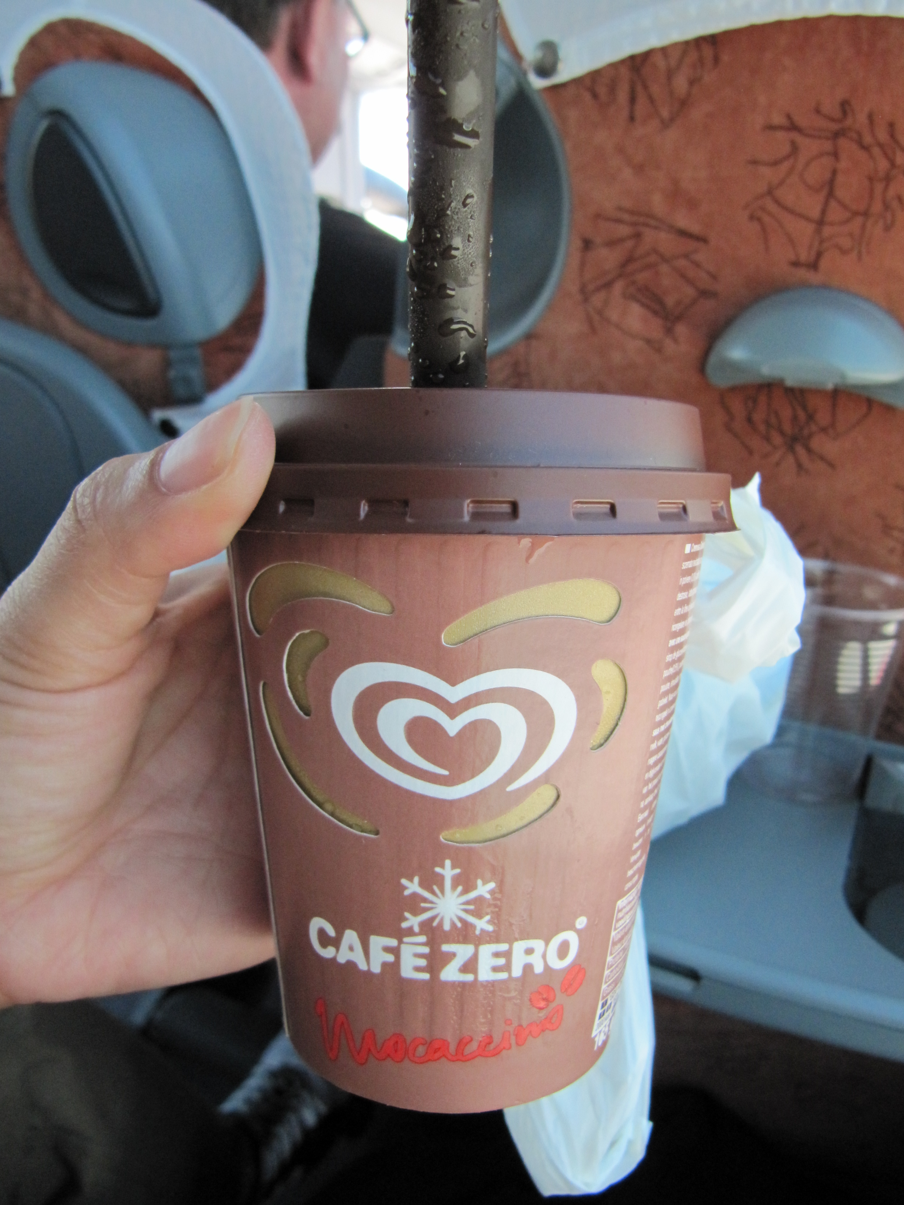 These are sort of like the frappucinos in Europe. They are stored in an ice chest, like ice cream bars. They are semi-frozen and all you need to do is to open the lid, remove the seal, stir it with the straw and drink away. They come in Espresso, Mochacchino, Capuccino, and this fruity one that was allegedly not so good (peach with ginger)