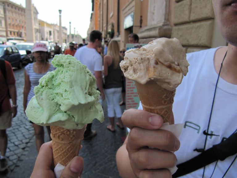 Gelaterias were everywhere, especially in Italy. Near any major tourist attractions, you can spot a gelateria every block. We mostly tried the fruity flavors and sorbet because it was way too hot (over 95 to 100 daily plus the humidity), but I have to say the best flavors we had were from a bar near the Vatican – Pistachio and Caramel. The caramel one even had little bits of caramel crunch in the gelato! (by the way, the word “bar” is used differently than in the States. In Italy, a “bar” is usually a small shop that serves espresso, paninis, gelatos, and granitas. Sometimes you can get wine or beer.)