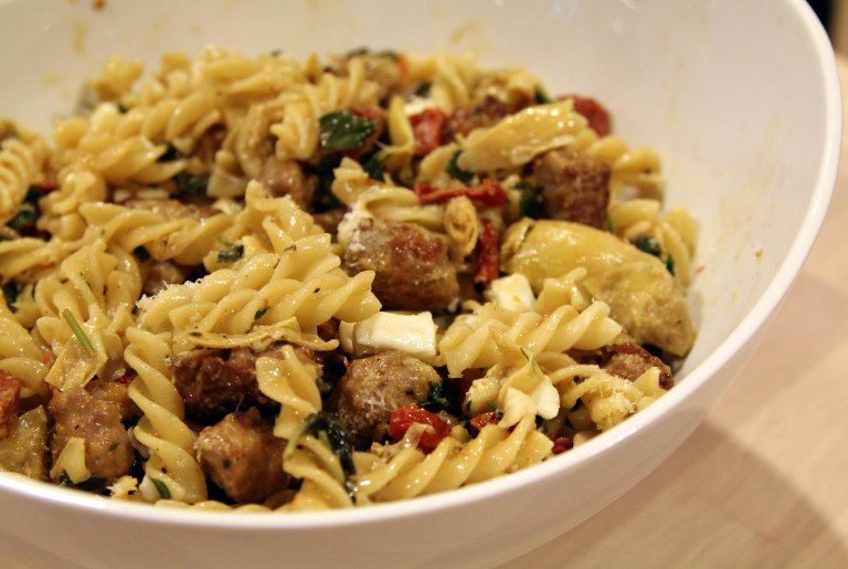 I deeply miss those plates and bowls of comforting perfection from Italy….yes…I am suffering from pasta withdrawal. (That and espresso and pastry and gelato withdrawals as well…) The other day while I was thinking about those al dente noodles again, and all of the sudden, the “stress-free-Italian” Episode of Giada’s Everyday Italian popped in my head and said hello. That fusilli looked so good that it made quite an impression in my memory. After quickly looking up the recipe, I was pleasantly surprised that I had all the ingredients on hand except for mozzarella. Italian cuisine is all about simplicity and quality ingredients that each stands on its own. Unfortunately I only had cans of whole artichoke hearts on hand so to make up for it, I made a point to buy fresh mozzarella so it’ll take me just this much closer to Italy. Not much modifications were done to the recipe, except I used sweet Italian sausage instead of spicy ones, canned artichoke hearts instead of frozen ones. Wonderful dish! Perfect al dente fusilli tossed with the sweet sun-dried tomatoes and artichokes, the little bites of smokey and browned meaty sausages, and that salty, buttery mozzarella….. I highly recommend you to try it!