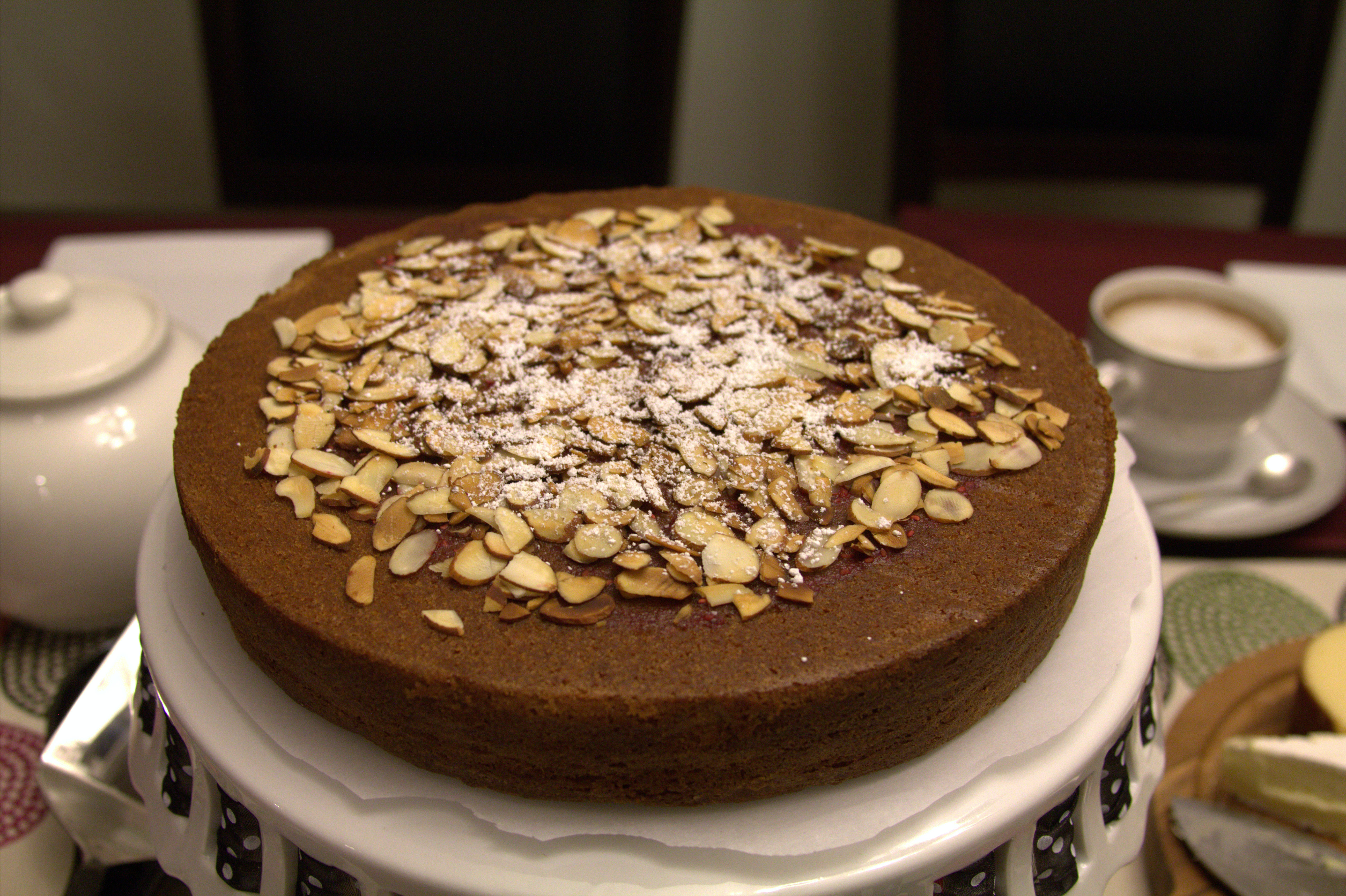 I experimented with using half almond meal and half flour on one occasion, and I can say that while I do love the stronger almond taste, it was way too crumbly and moist, not easy to cut cleanly – if you are into presentation and that sort of things. Anyway, while I flipped the cake mold over to extract the cake pictured below, something horrible happened! A chunk from the middle stayed behind….Perhaps I didn’t wait for it to cool down enough or perhaps I blame it on the excessive crumbly texture, but I quickly covered it up by smearing raspberry preserve, then topped with toasted almond slices and finished with powder sugar.