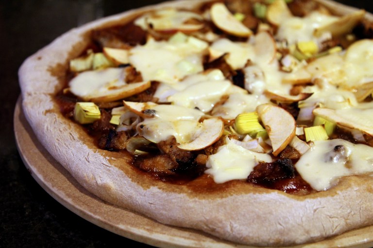 - The order I placed the toppings: First, a small ladle of bbq sauce, spread evenly on dough – then the slices of mozzarella, and meat from the pork ribs (cut in smaller chunks) – sprinkle on the chopped leeks and place the thinly sliced apples. More cheese on top if you like!