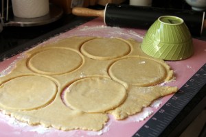 9. Roll out the dough into a thin sheet (1/4″-1/8″ thickness) and cut out round disc shapes for empanadas, use round molds or a small plate or cup as a mold, you can choose how large based on whether you want small or medium sized empanadas . (note: 5″ round molds make medium size empanadas, fits 1 tbsp of filling inside. )