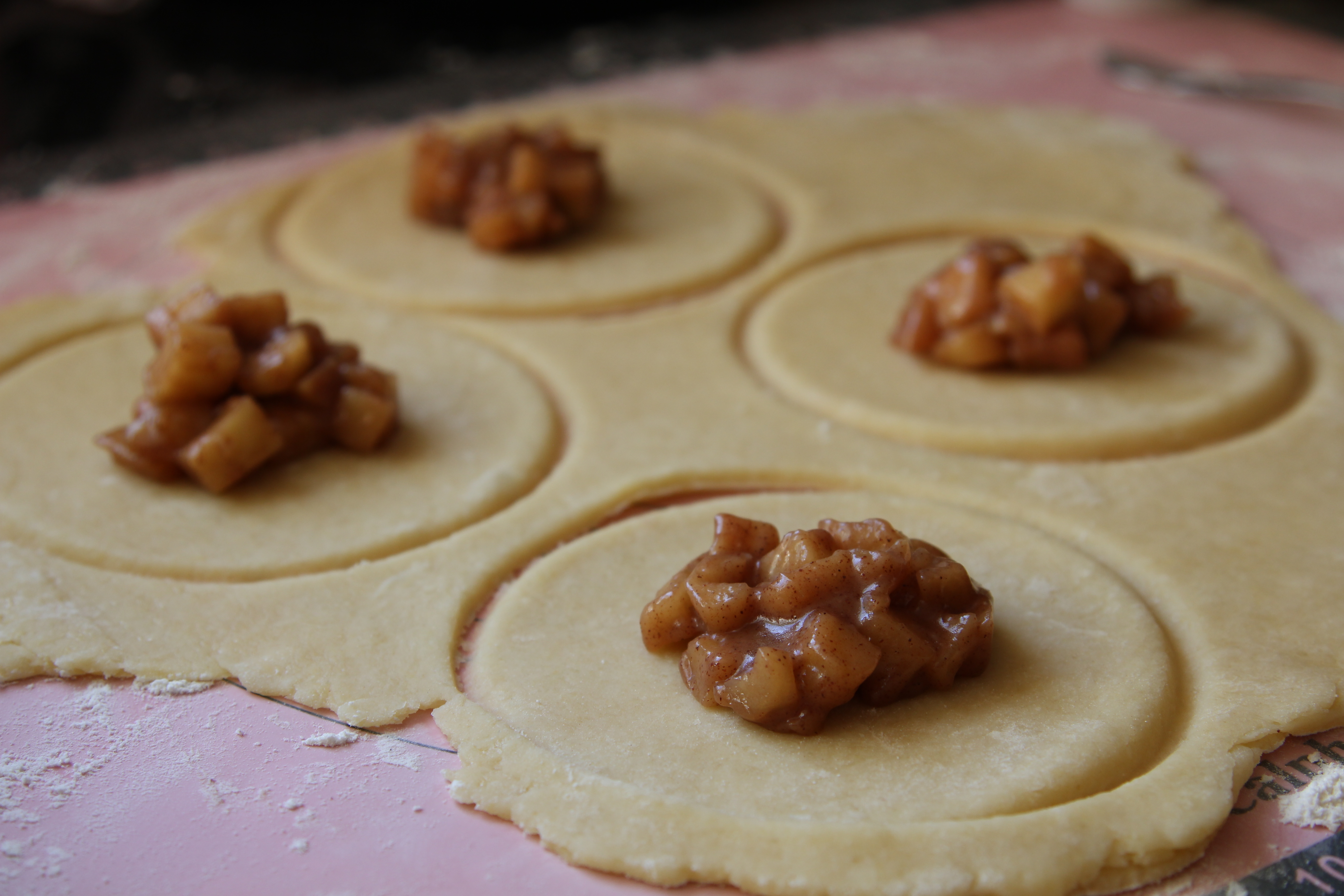 10. Put ~1 tbsp of apple filling in the center of the dough. Wet the dough circumference with water, fold the circle in half, pat down to push out excess air, pinch and flatten the edge tightly to seal. Using a fork to crimp the edge.