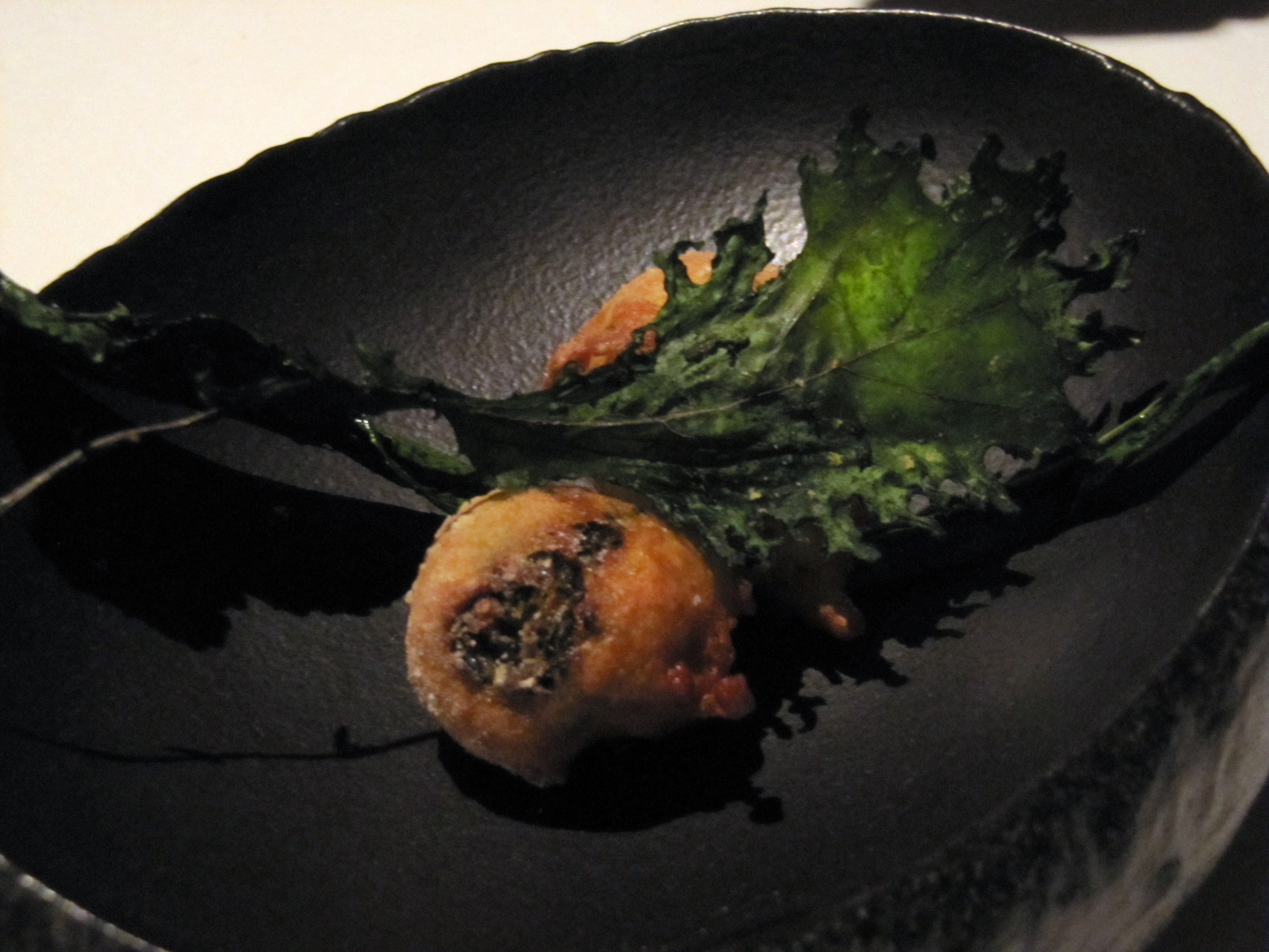 chef’s appetizer – kale chip with a fritter (corn or sweet potato?) stuffed with a mushroom pesto mixture.
