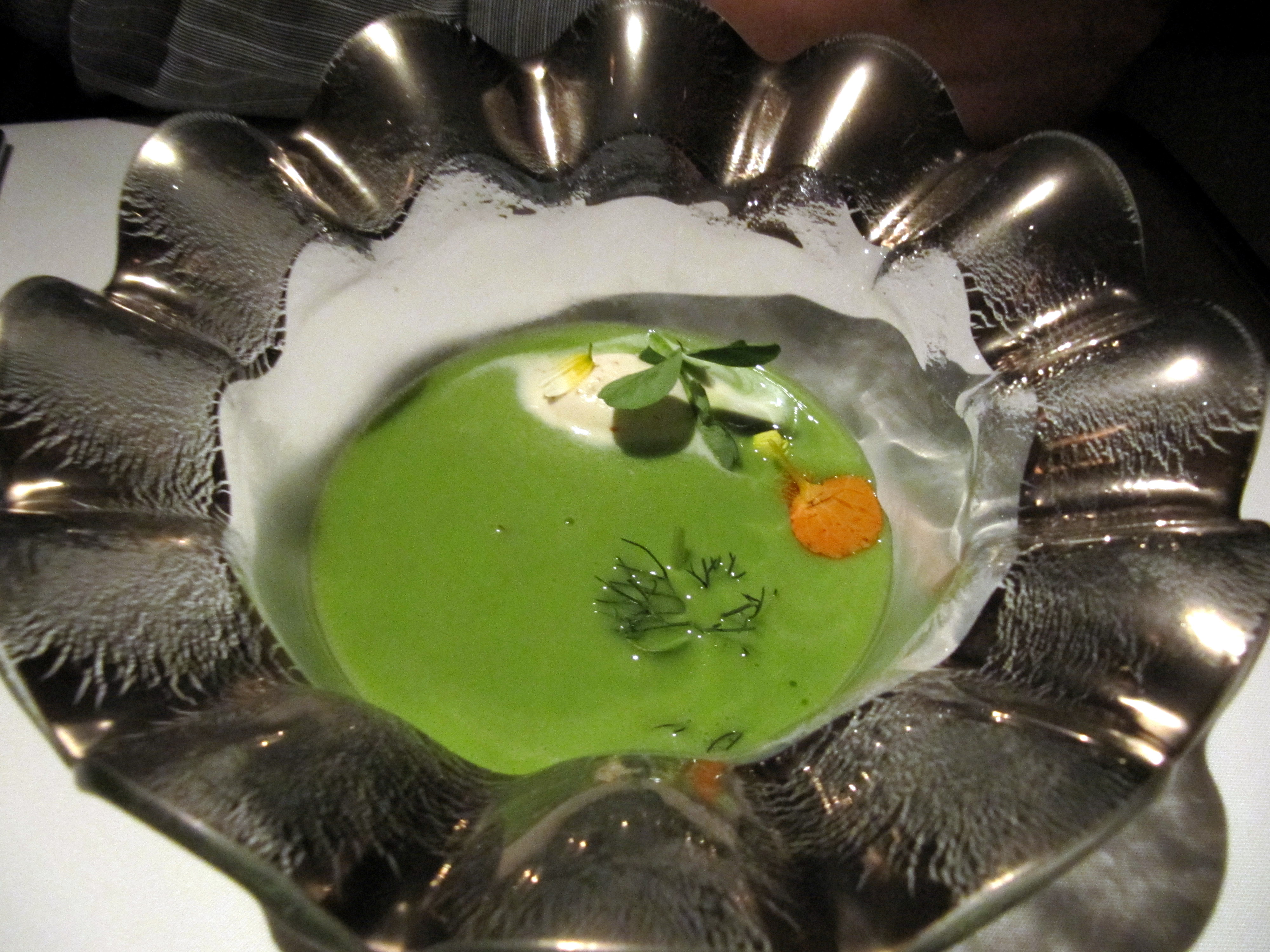 Joe’s 1st course: A garden green soup, stone ground mustard cream, herbs and shoots “multi-color”. The mustard cream and the herbs and shoots came beautifully presented inside the bowl like art, then the server poured the green soup tableside. A lot of “oohs” and “aahs” from me.