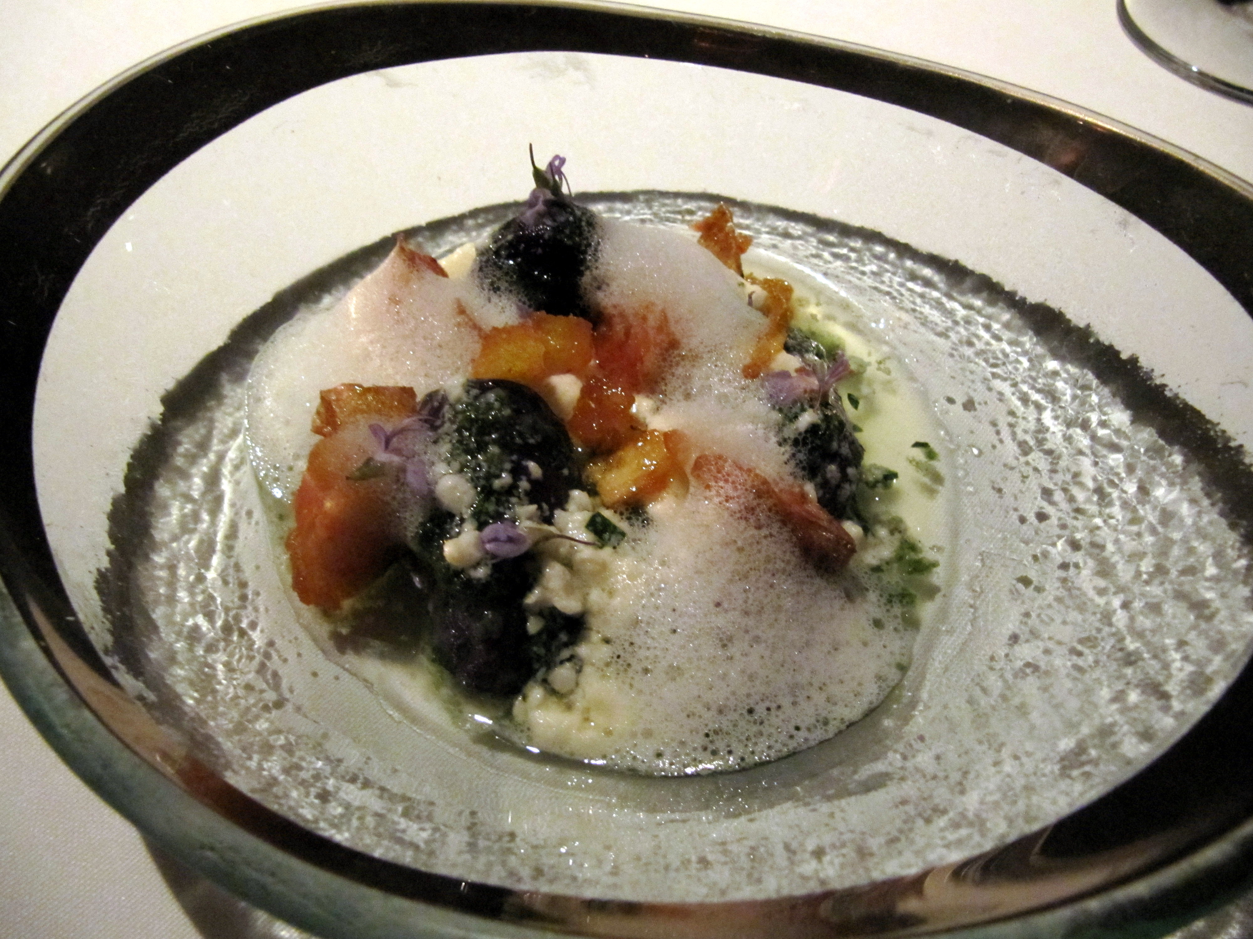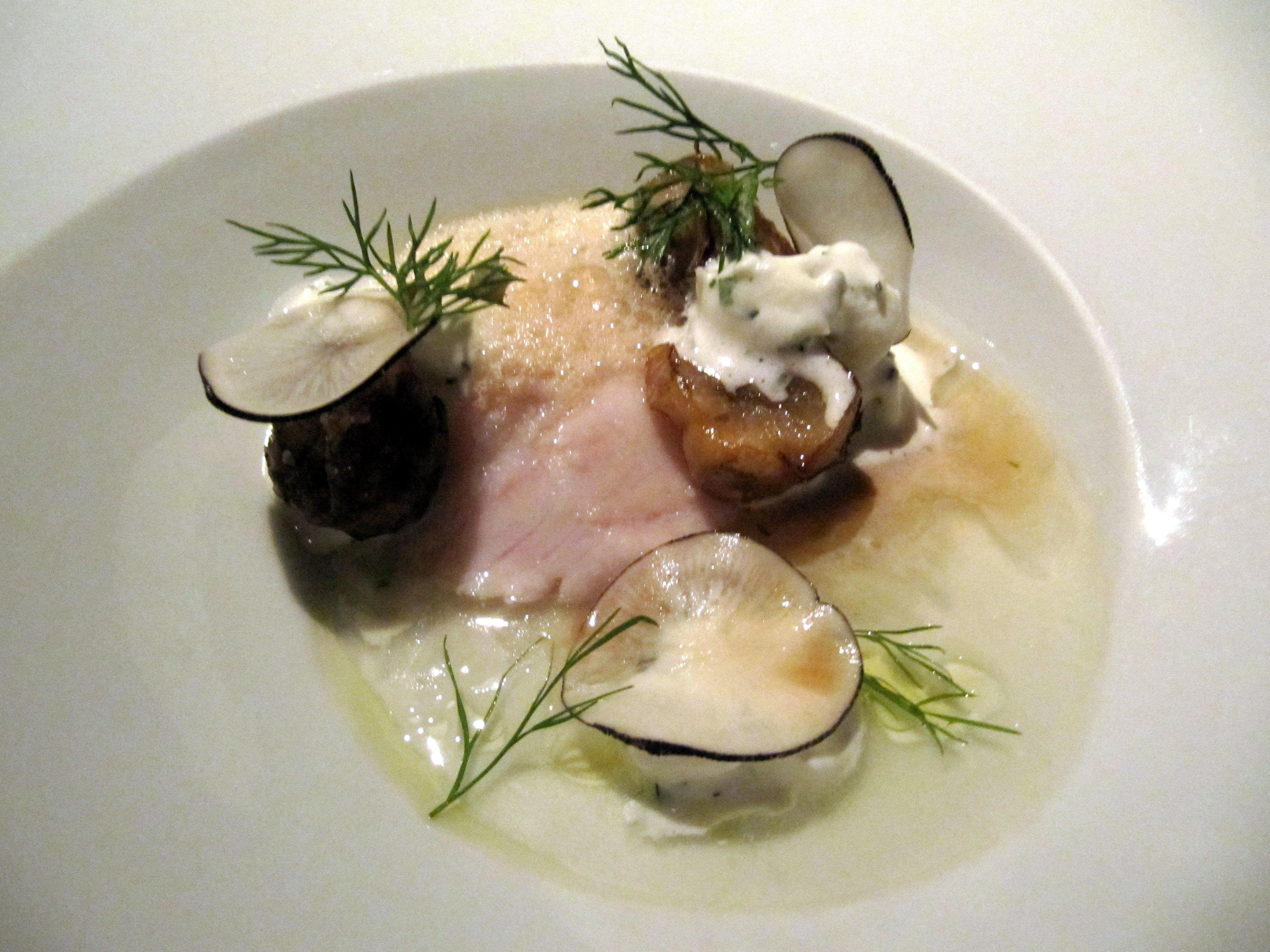 My 3rd course: Black bass, green tomato water and dill, black radish with sunchokes, lobster. (ps..that lobster foam!!!!)