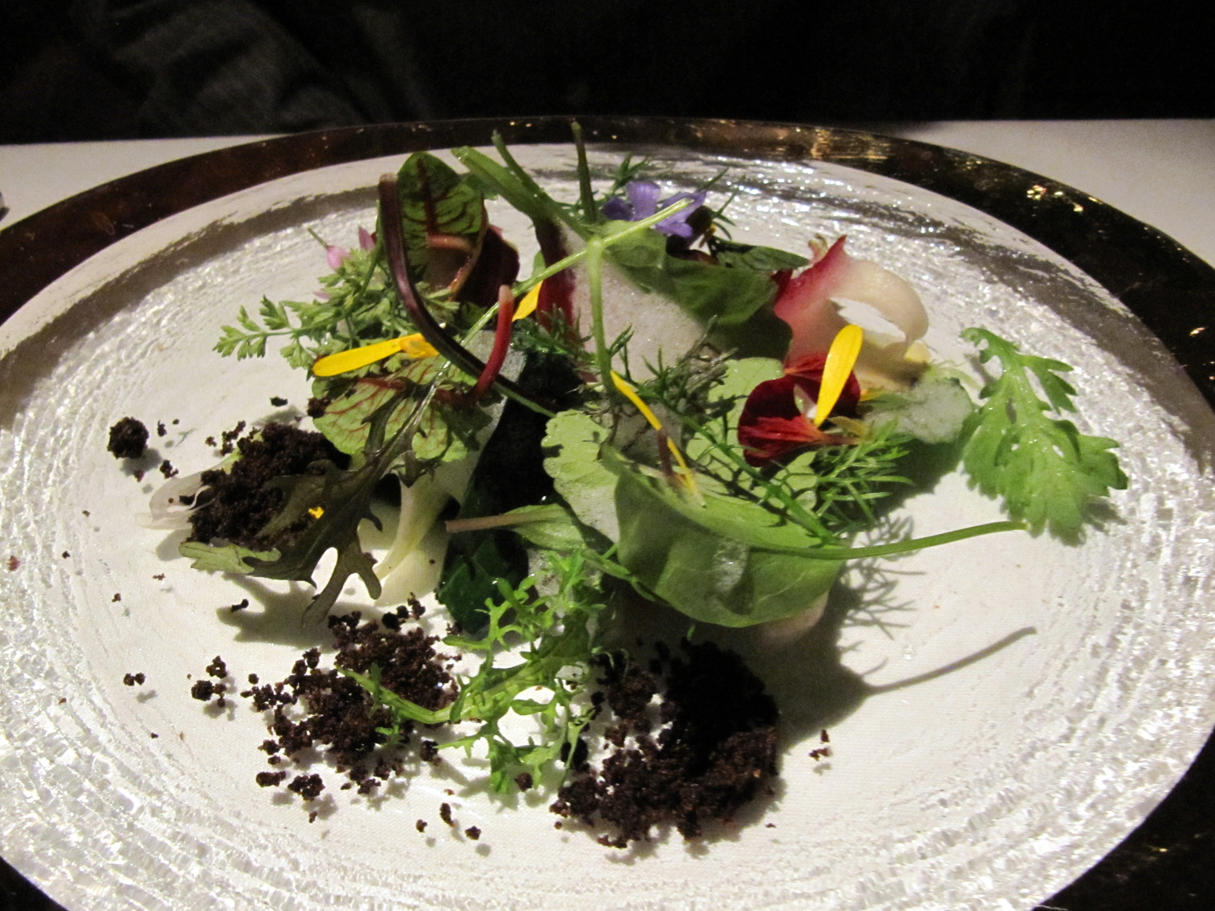 Both of our second course, titled “Into the vegetable garden”. This is Chef Kinch’s signature dish at Manresa. Everything is from Love Apple Farm in Santa Cruz. This dish includes around 30 vegetable and herbs (leaves, shoots, flowers, and roots) and the mixture in the front resembles the “dirt”, which is made from roasted chicory root, potato and parsnip.
