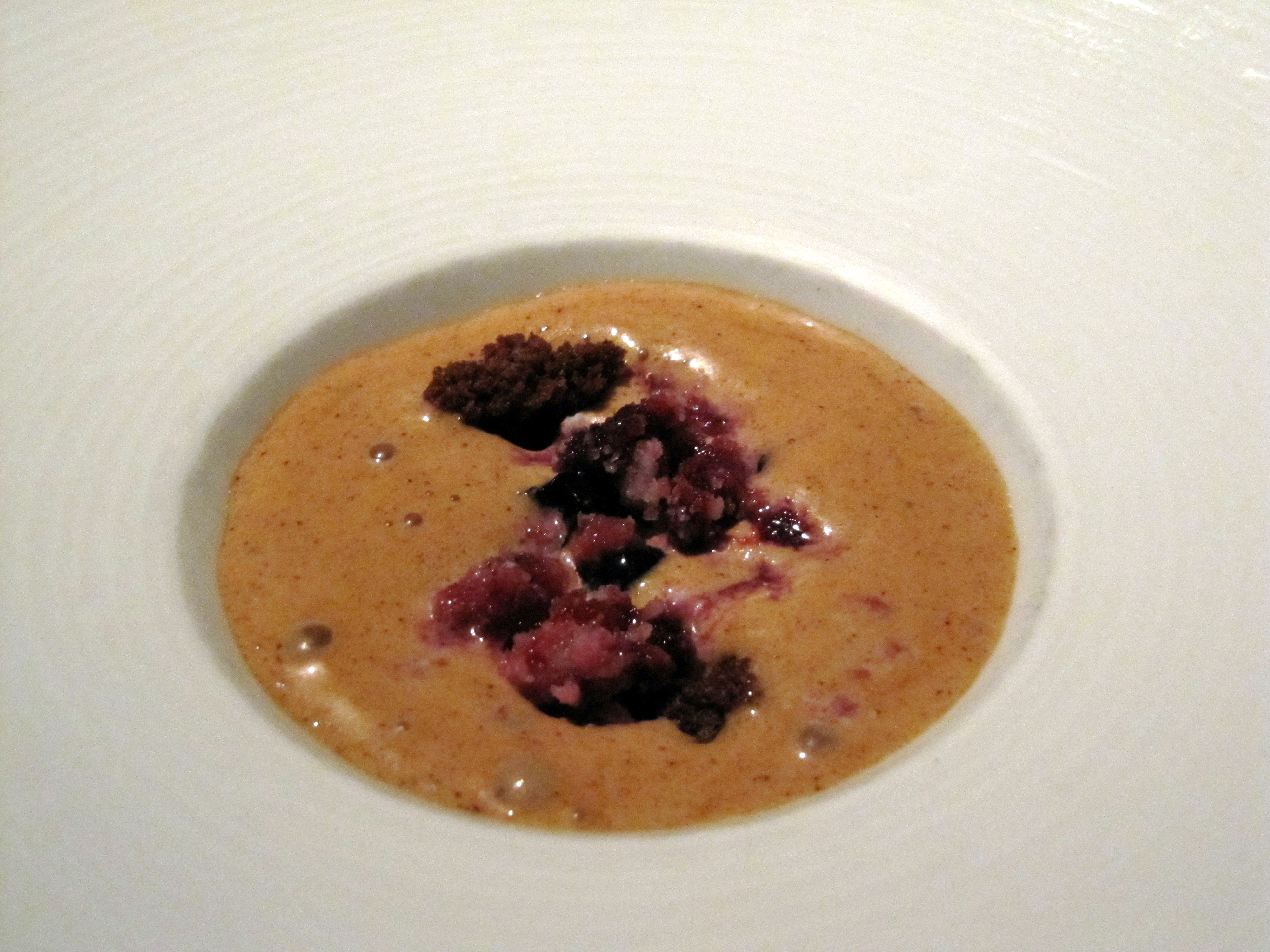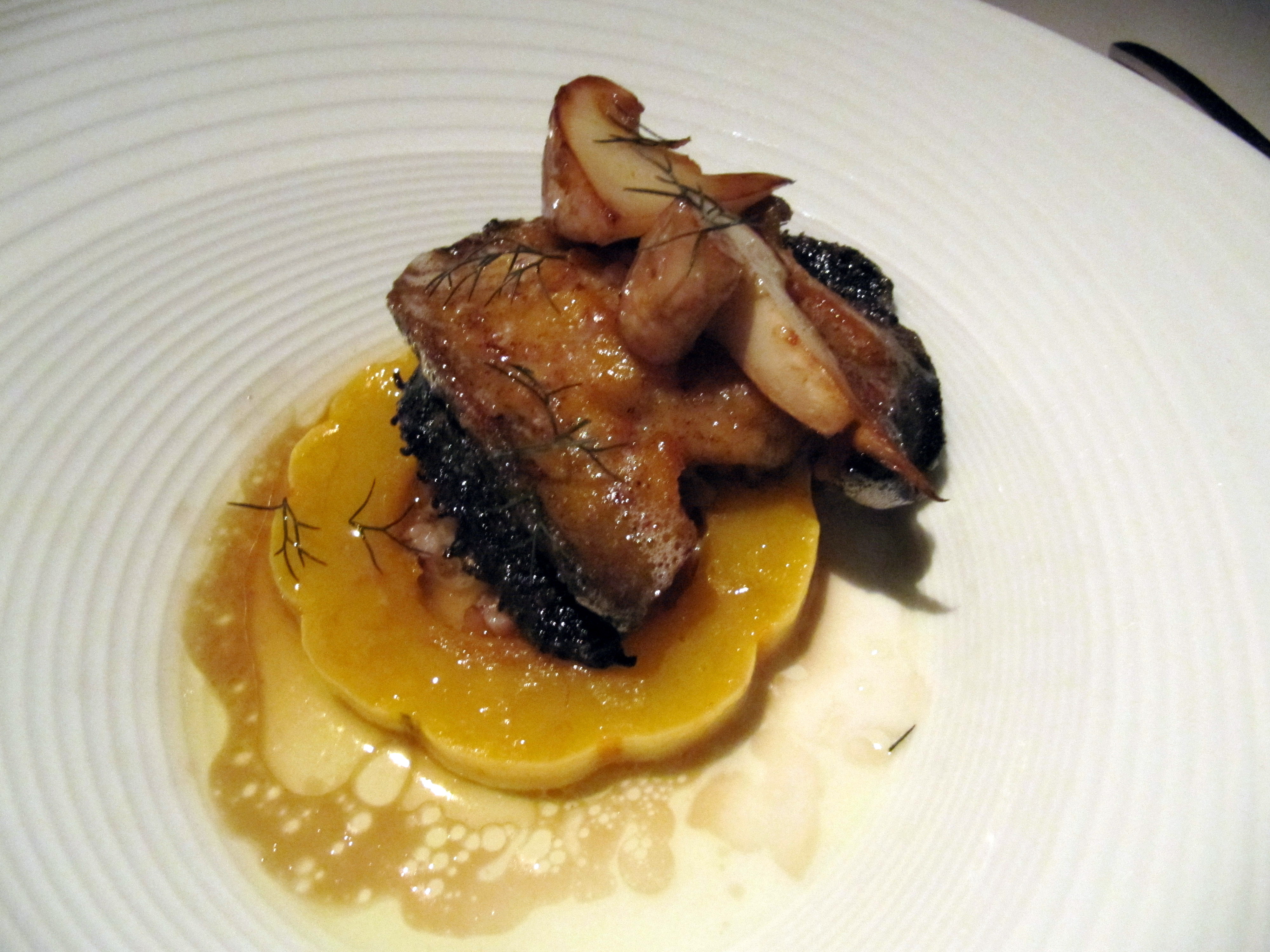 The intermezzo to cleanse our palate. Can’t remember the full detail, but it tasted like a liquid pumpkin pie with huckleberry granita on top. Not heavy at all, truly Fall in a bite. Slightly savory but overall a great palate cleanser.