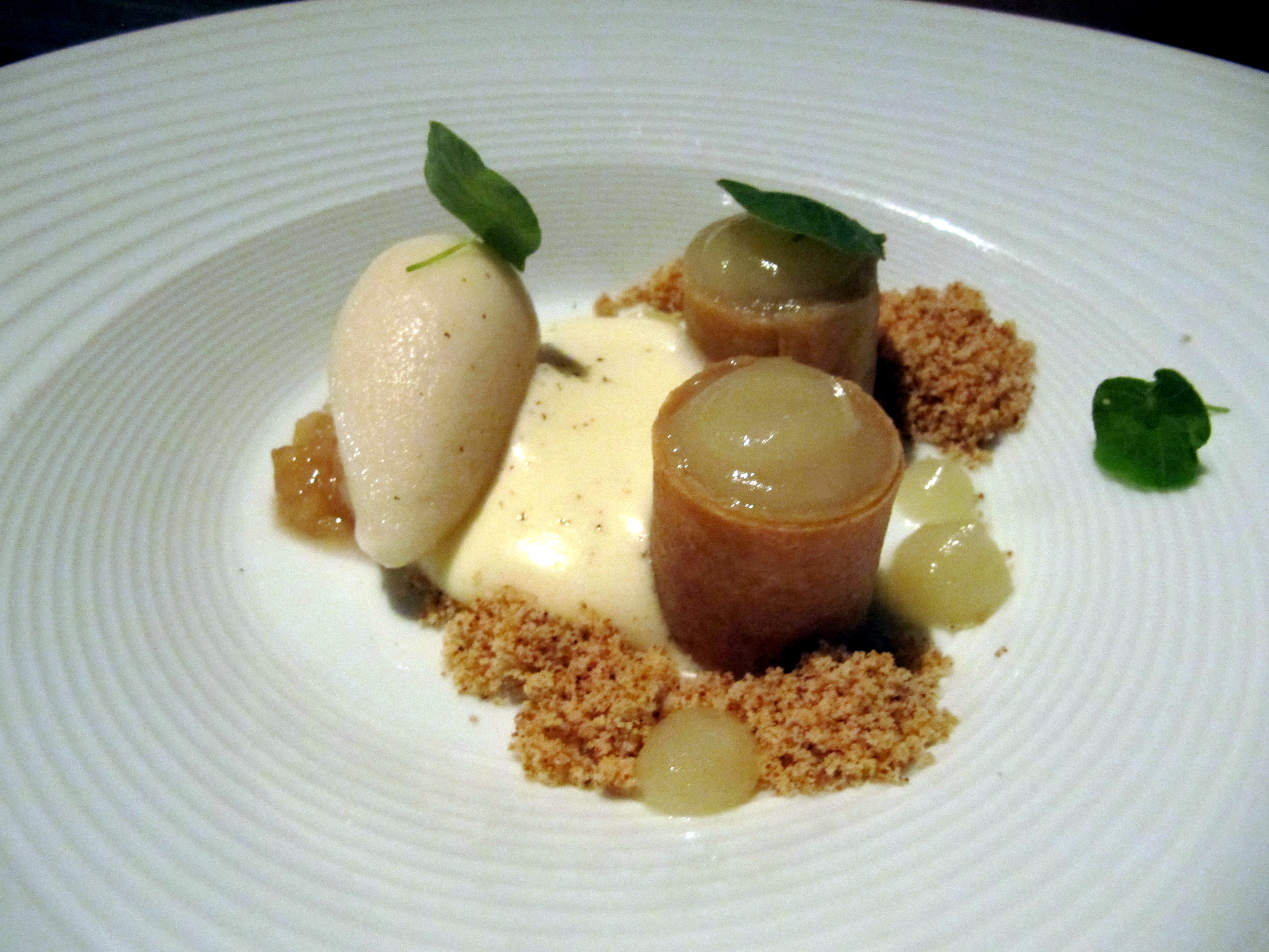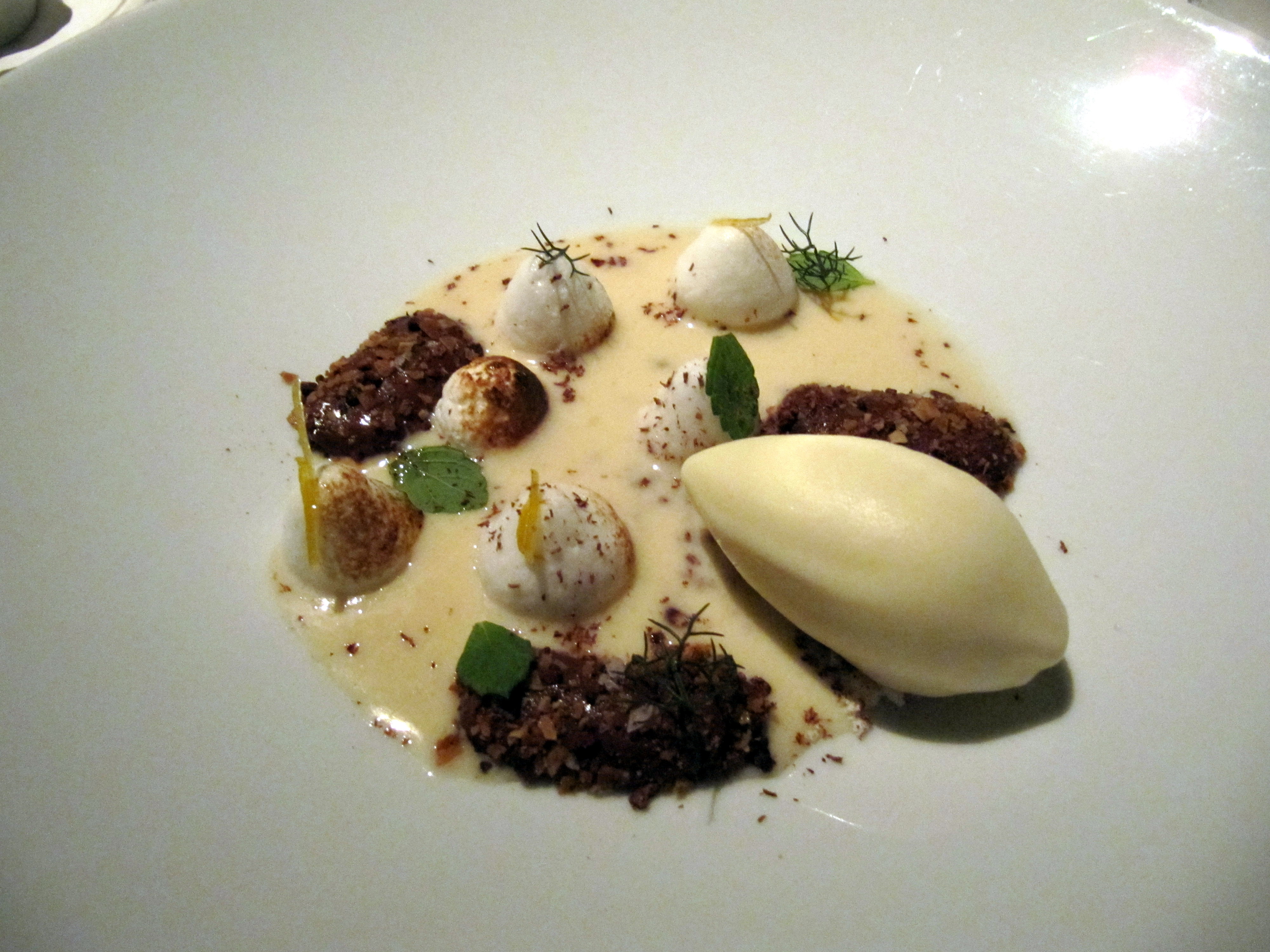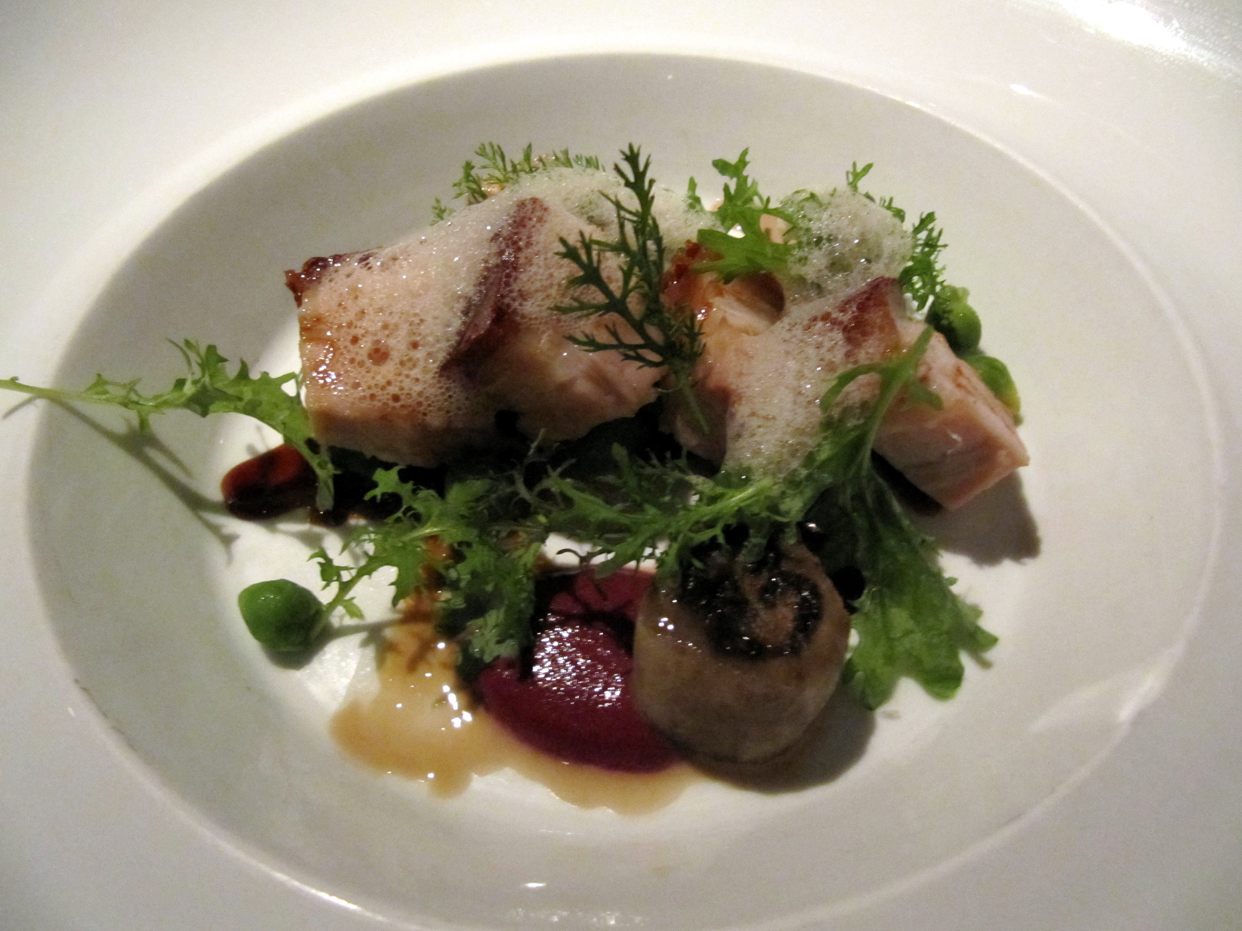 My 4th course: Pork belly with huckleberry soubise, walnut emulsion with chick peas. Mmmmmm crispy pork belly. Really perfect with the hubkleberry’s sweet and tartness. Not sure what the brown thing with the black swirl was, but that was soooo tasty. We guessed eggplant or maybe some kind of mushroom, but the texture is definitely more eggplant.