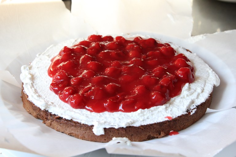 I think overall I still prefer a chocolate chiffon cake for this recipe. That is where you separate and beat the egg whites and yolks, fold them together at the end. It’s much airy and fluffier. I know the traditional black forest cake calls for sponge cakes, and there are endless recipes for this. Everyone claims theirs to be “authentic”. I really liked the taste of the recipe I used but not necessarily the texture. You can even use a box cake mix, like Devil’s food or just a good ol’ fashion chocolate cake mix, nobody will know 🙂