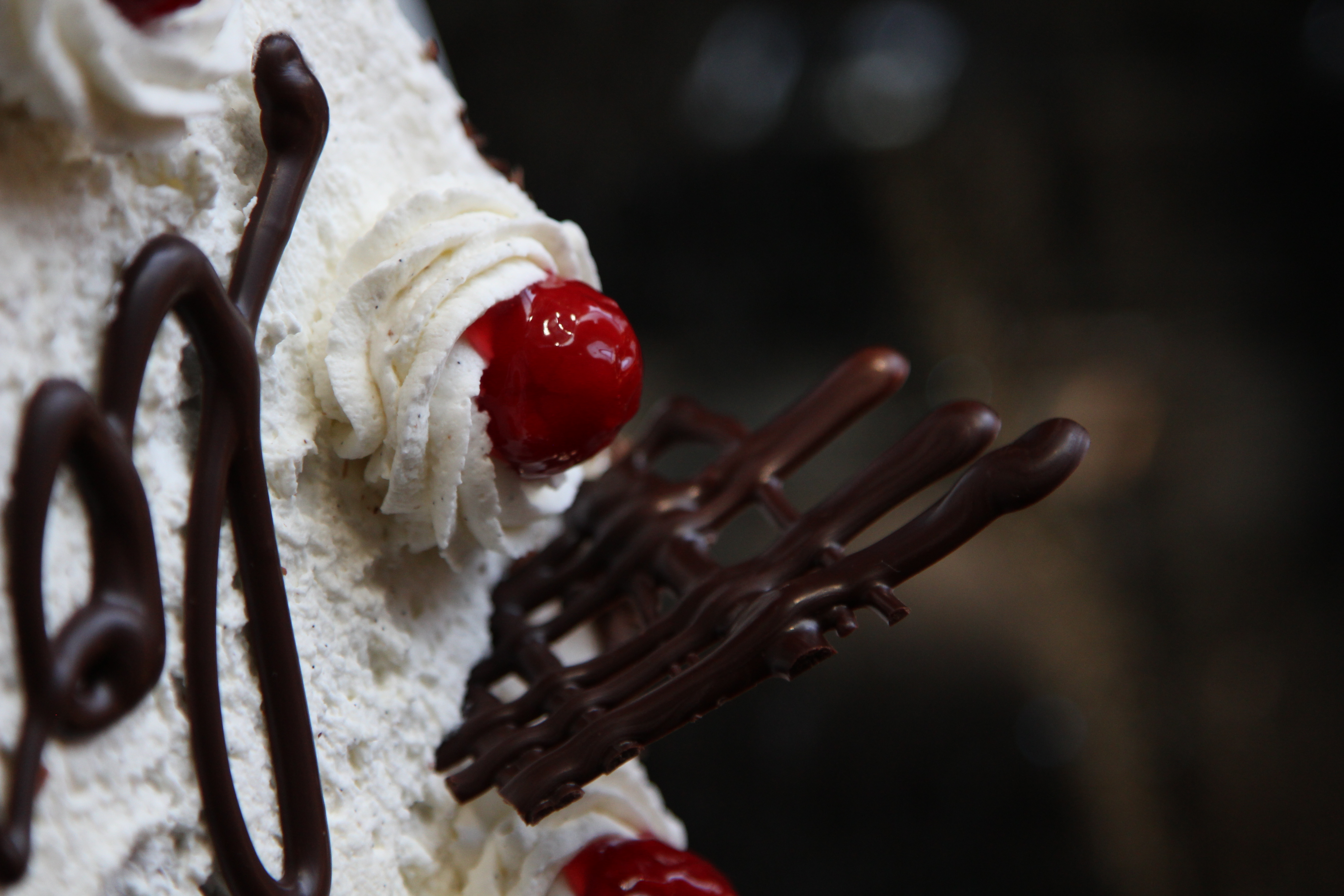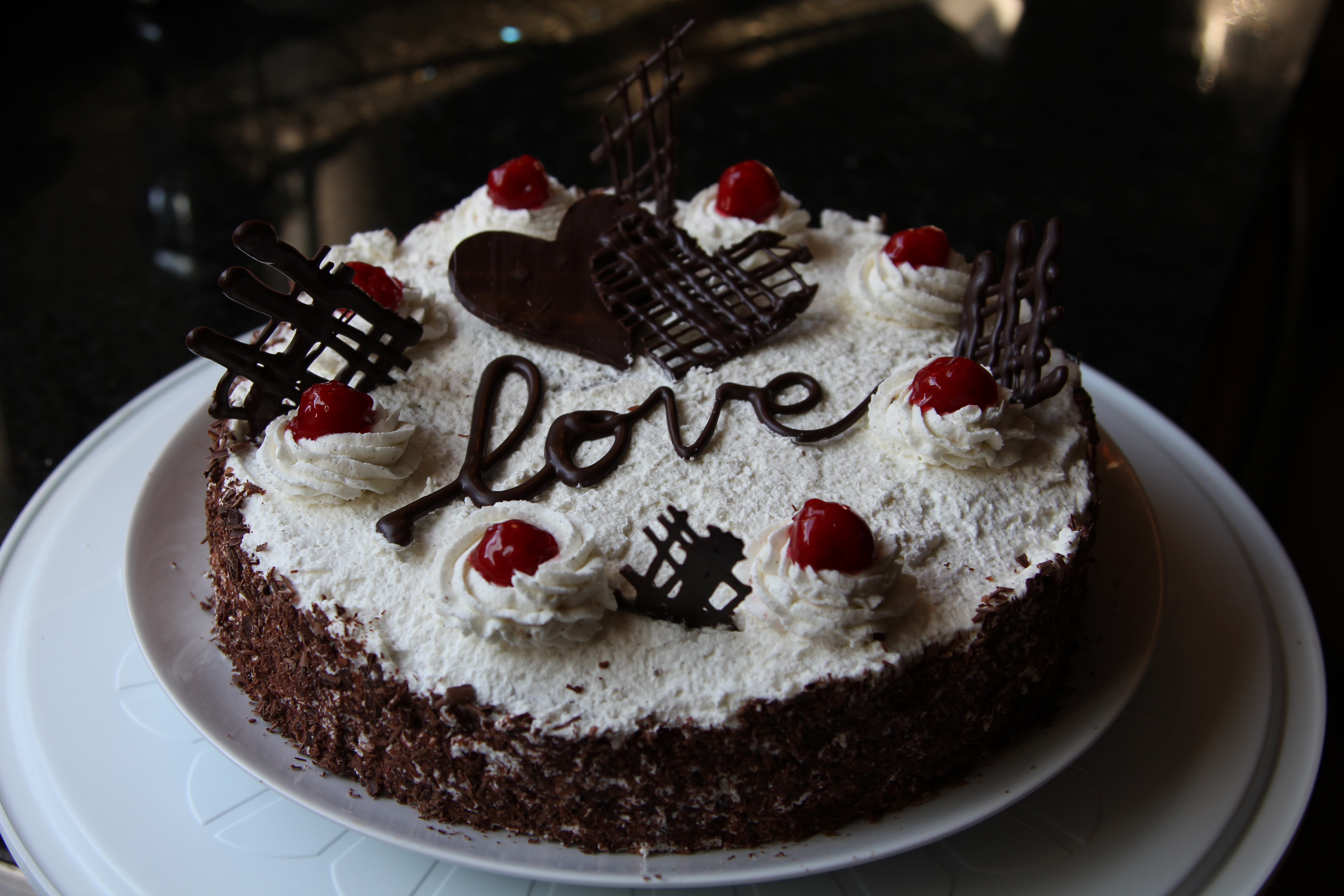 - Cover the whole cake with whipped cream, decorate it with chocolate shavings and garnish with cherries!