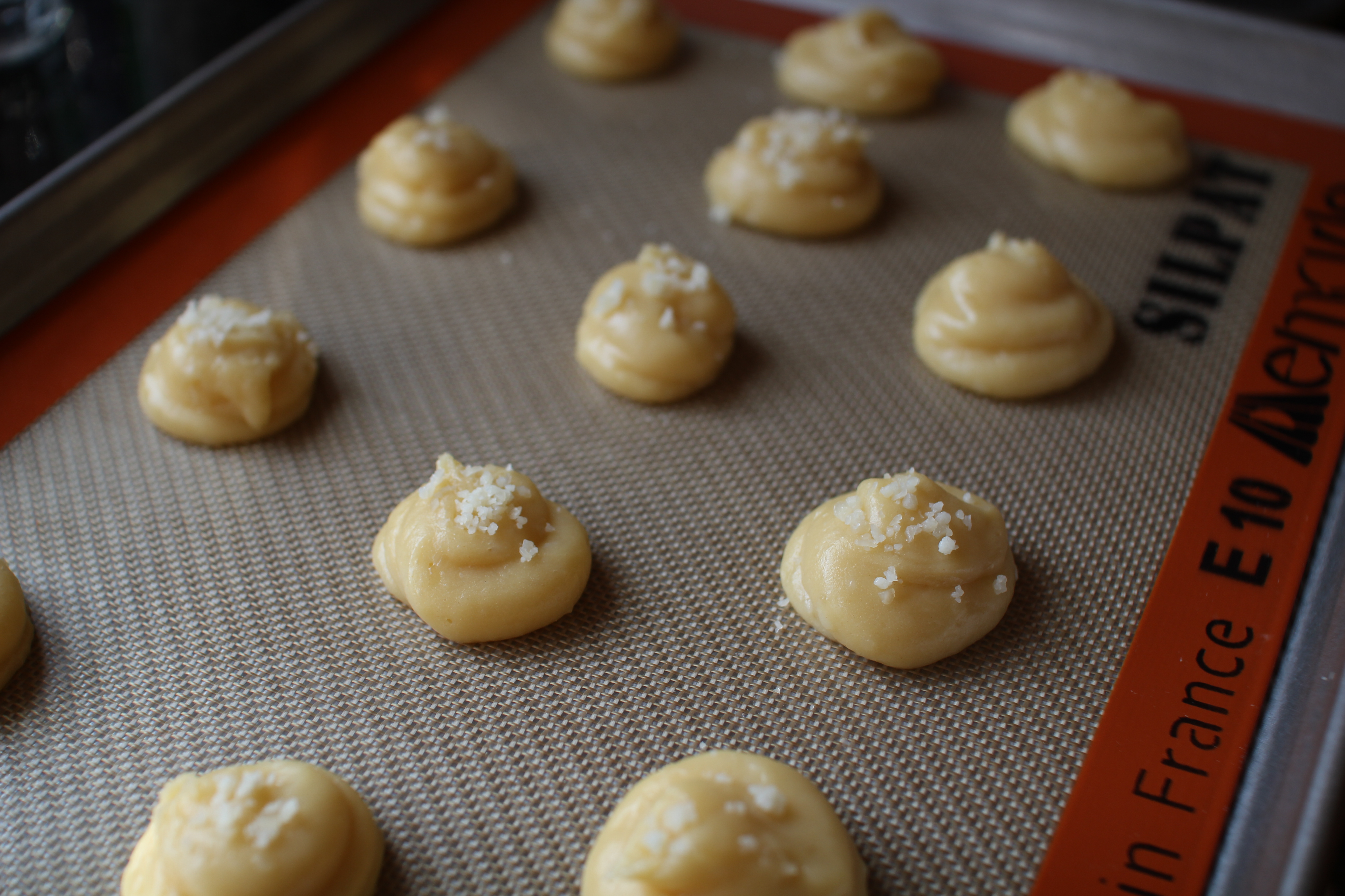 3. Spoon or pipe it onto a baking sheet, (remember to press the peaks down with a moistened finger, they can burn) and bake in a hot oven (425 for 10 minutes, 350 for another half hour or so, is ideal) for cream puffs, profiteroles and gougeres.