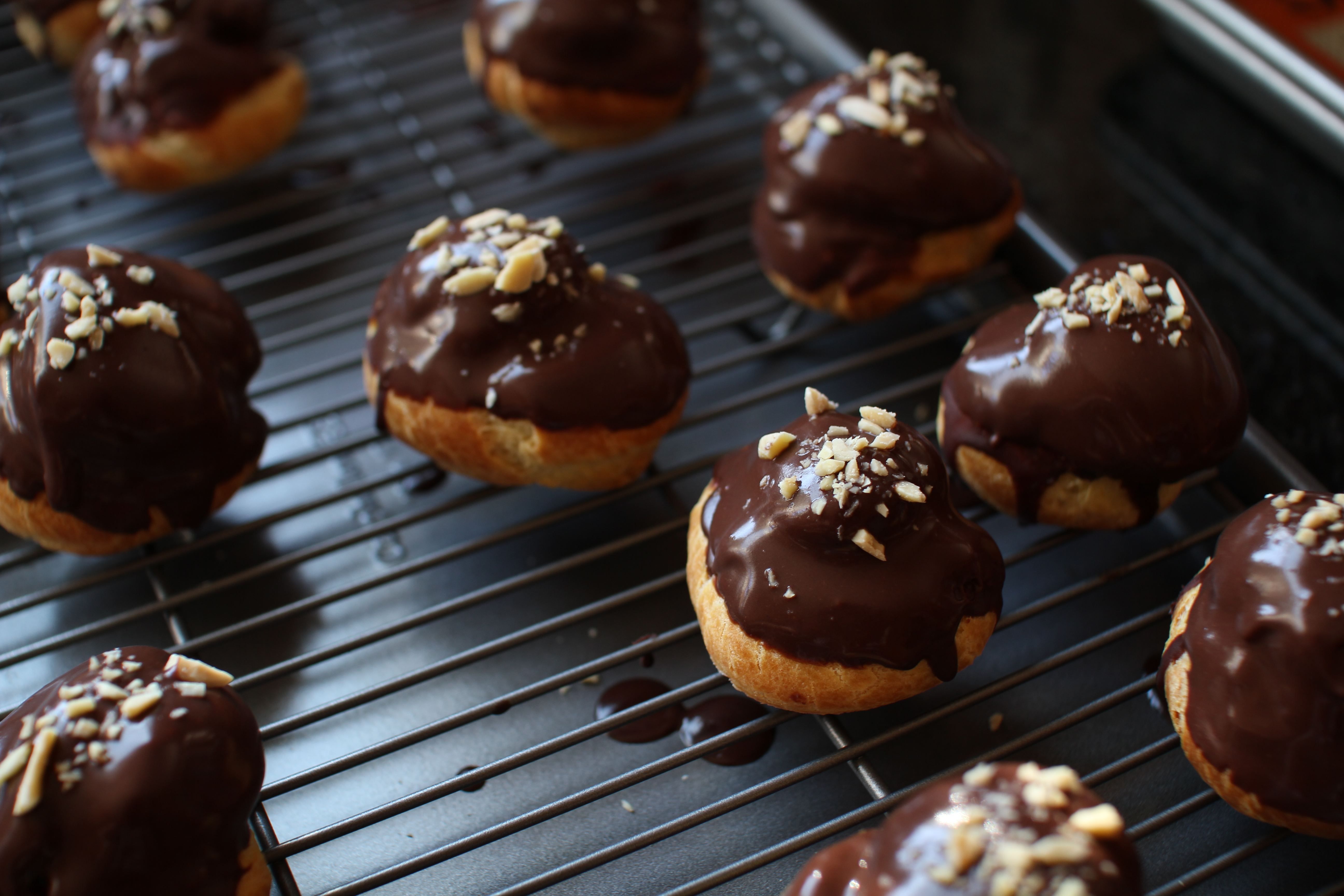 - For sweet cream puffs or profiteroles, I made a simple pastry cream to fill inside the choux shells, then I dipped the top in melted dark chocolate, finished with some chopped toasted almonds and hazelnuts. You can fill the choux pastry with jam, or cut them open and put a scoop of ice cream in the middle.