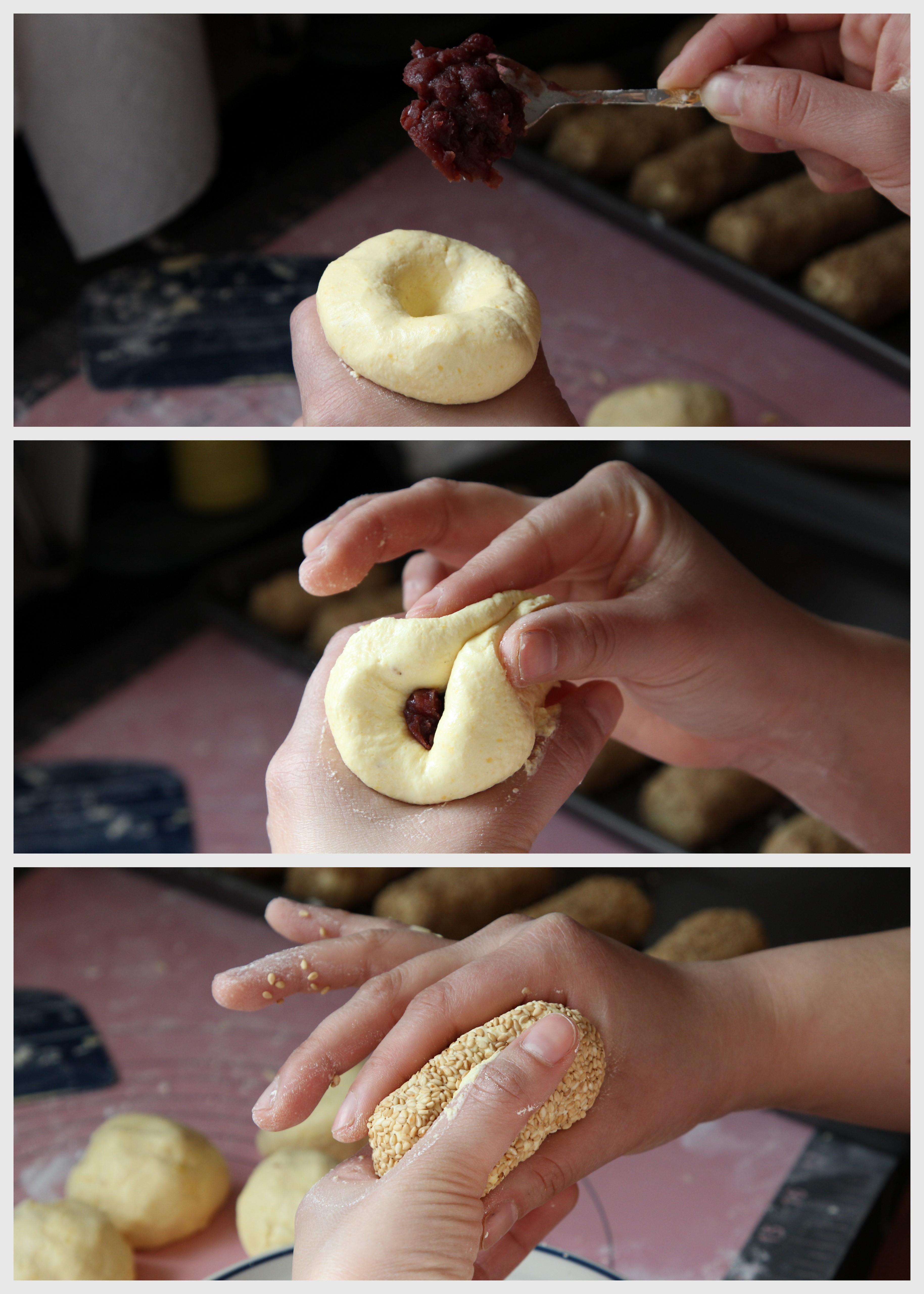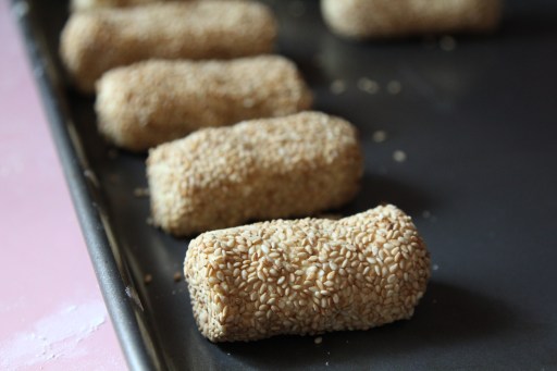- Dip the stuffed dough in a bowl of white sesame. Repeat the same process for the rest. If you’re not frying and serving this immediately, refrigerate them in an airtight container so the dough doesn’t dry out. You can also freeze these for up to a week or so, no need to thaw, just add a couple more minutes to the frying time.