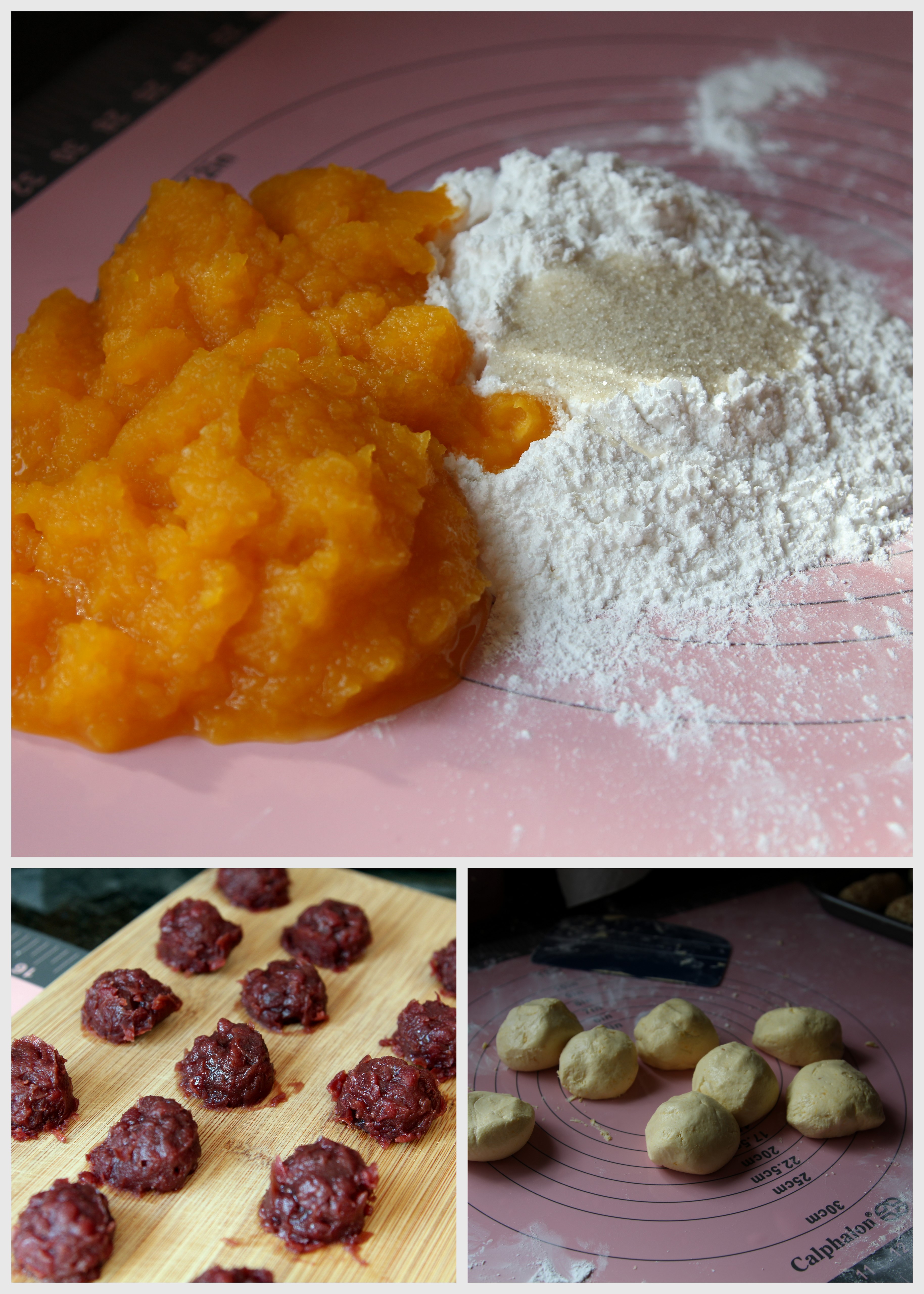 - Combine pumpkin, flour, and sugar together. Roll and knead until it becomes a dough form and not sticking to hand. Add extra rice flour if the dough is too sticky. If the dough is too dry then add a teaspoon of water at a time.