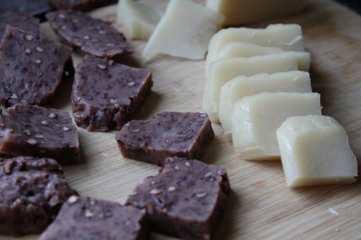 My Mom-in-law makes Nian-Gao every year. The purple one is made with azuki red beans and dried dates, the white one is with plain white sugar. These are glutinous rice cakes, it takes forever to steam! Freshly steamed rice cake has a very soft and sticky consistency and can be consumed as it. As it ages, the cake hardens. One can coat the slices with a simple egg batter and either fry or pan-fry them.