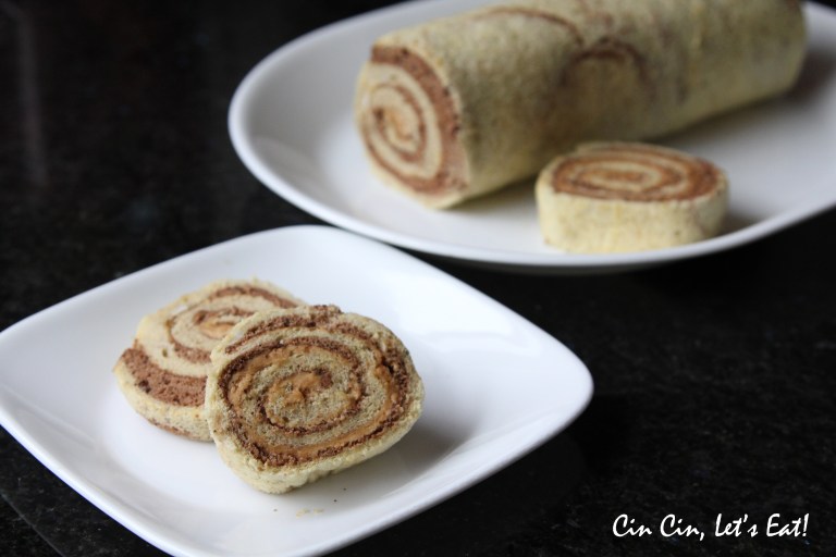 I’m still trying to master folding egg whites into the batter without over-folding, which was what happened here I think… I ended up with a not-so-fluffy cake that didn’t rise all the way up. The swirling effect didn’t turn out as well as I thought probably due to the wrong consistency of the batter. But nevertheless it was light and yummy! Another thing to remember is that since every oven is a bit different, I will have to adjust the baking time for next time. This cake could’ve benefit a few more minutes in the oven. The cake had a bit too much moisture for my taste, while making it very easy to roll, it was hard to handle once it was rolled into shape. The crumbs stuck to my fingers kind of like how the shells of ice cream sandwiches would. To solve this problem, wrap the whole cake in plastic wrap and slice it that way.