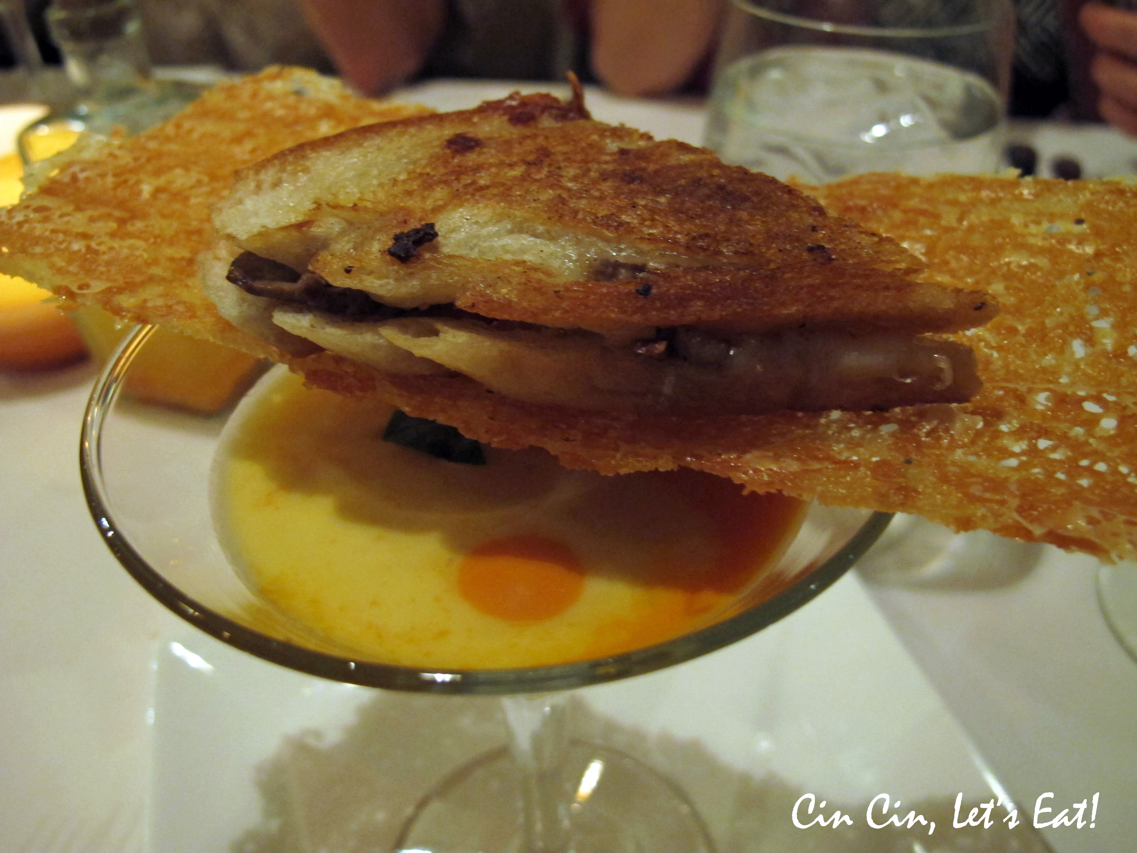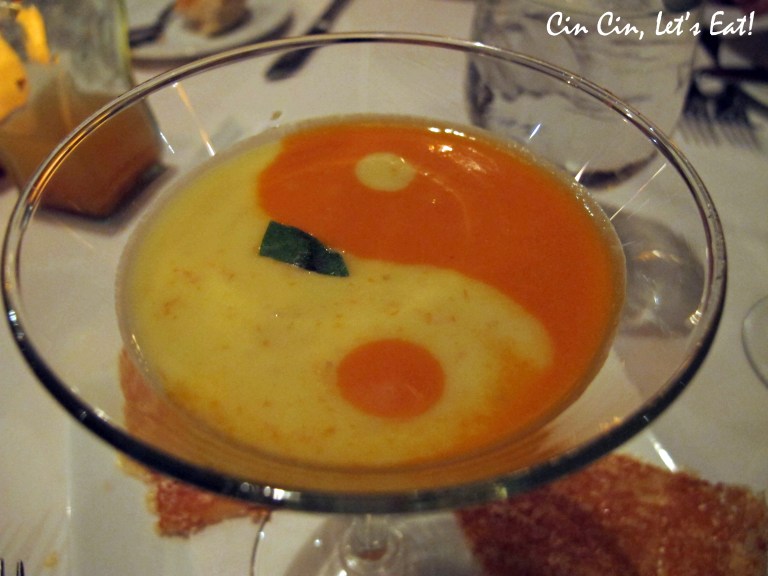 What a great way to start the meal. Rich, buttery, and crispy foie and pork sandwich pairs perfectly with the cold and sweet tomato soup. And I love parmesan crisp!