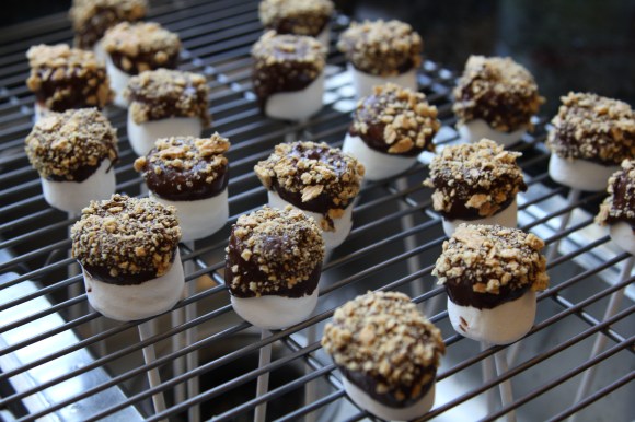 Note: It was hard to find some place for the s’mores pop to hang out and for the chocolate to cool. I placed a cooling rack over the sink (make sure it’s secure!) and let the finished products hang out on the rack, see below picture.