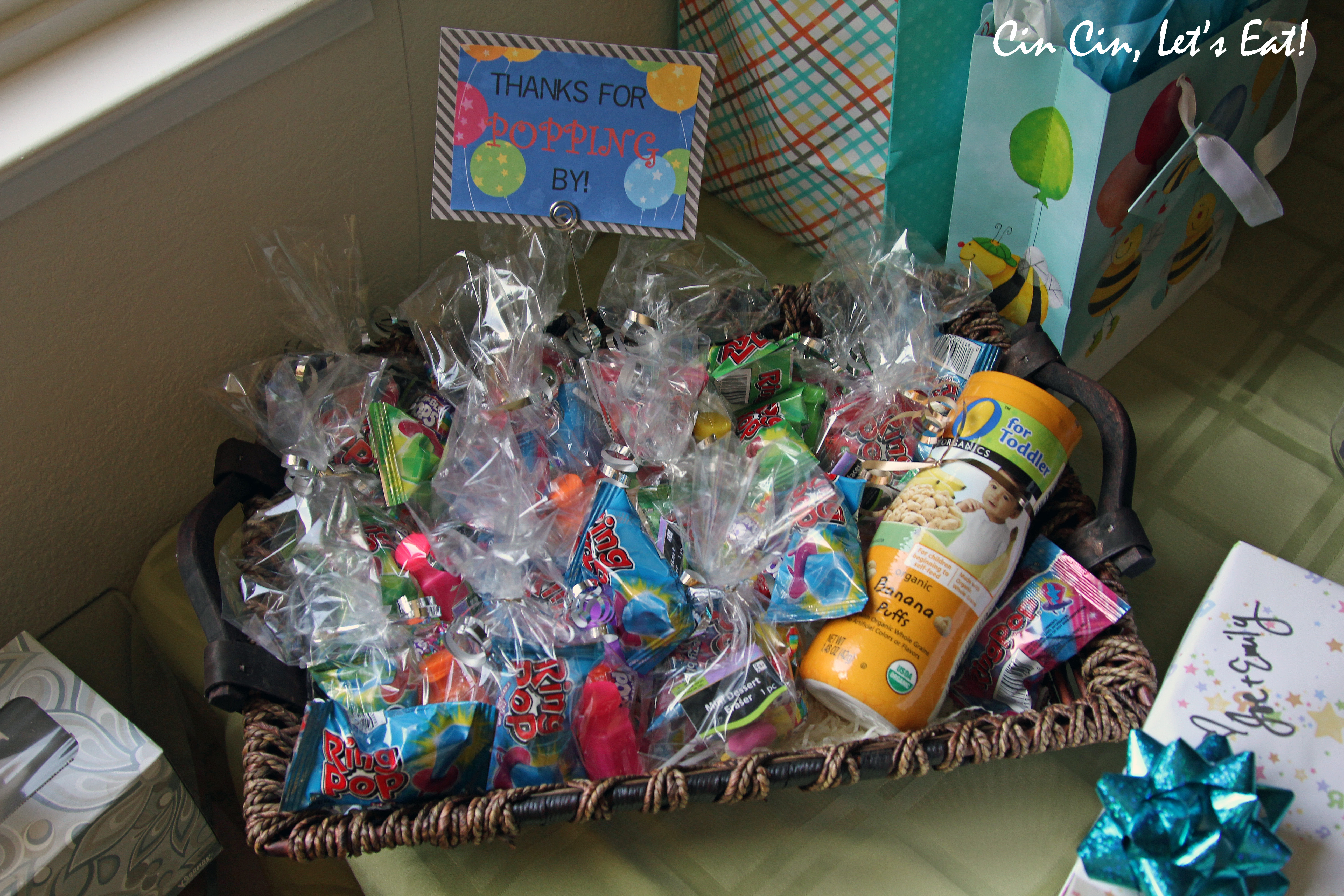 Party favors: blow pops, ring pops, bubbles, popsicle erasers. The bottle of the banana puffs was for the adorable 20-month-old toddler who attended the party.