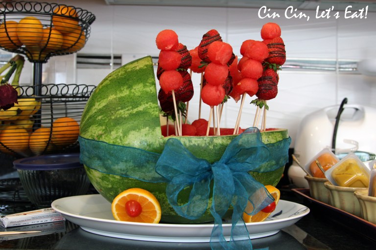 Fruit pops with a bassinet made from a watermelon. Got this idea off of Pinterest, the actual site here. I didn’t scoop out the watermelon completely because I needed to leave some in there to hold the skewers up. We originally planned to cut the fruits with cookie cutters (star, flower, and heart shapes) but the fruits were too ripe and couldn’t stay in shape. Eventually we scratched that idea and scooped out watermelon with a melon baller instead.