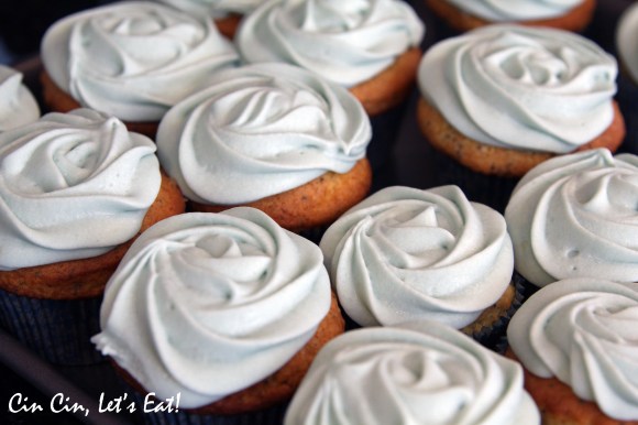Topped with cream cheese frosting (with a few drops of blue food coloring.) I used a 2D piping tip, but you can also use a 1M tip. Pipe from center towards the outside. I also added a total of 2.5 cups of confectioners sugar so that the shape will hold up more, but I didn’t have enough time to refrigerate the frosting so it was kind of loose.
