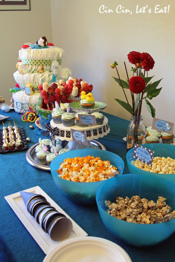 Hi food lovers, I have returned from my whirlwind summer adventures and can’t wait to share with you all the delicious food I sampled. Give me some time to sort through all the pictures and in the mean time, enjoy some pictures of a baby shower my friend Leslie and I hosted for our very dear friend Ike’s Bites. Since her belly is so BIG, it’s only fitting that we make the theme of the party “About to POP”! We decorated with balloons and incorporated “POP” into everything we served at the party.