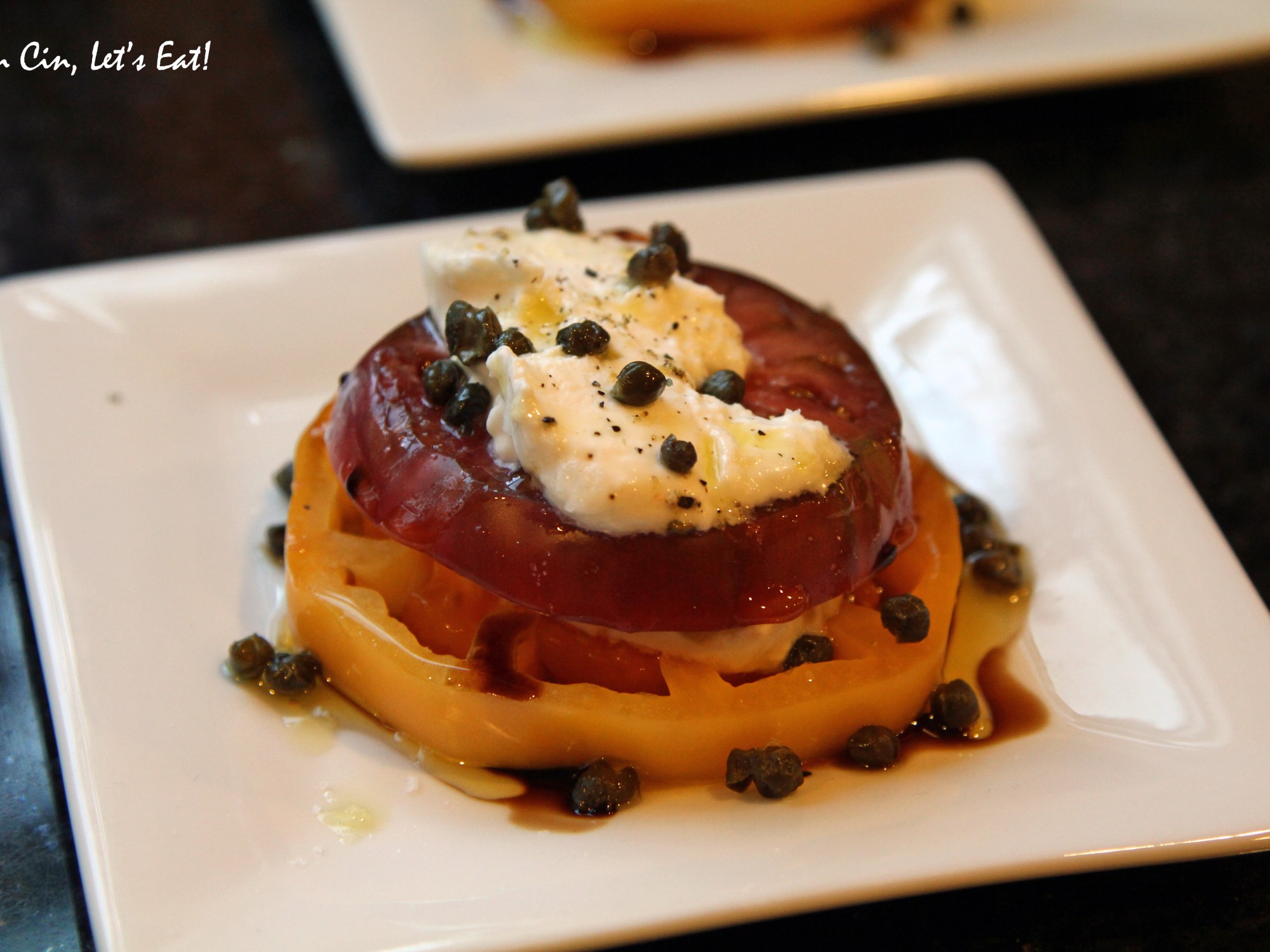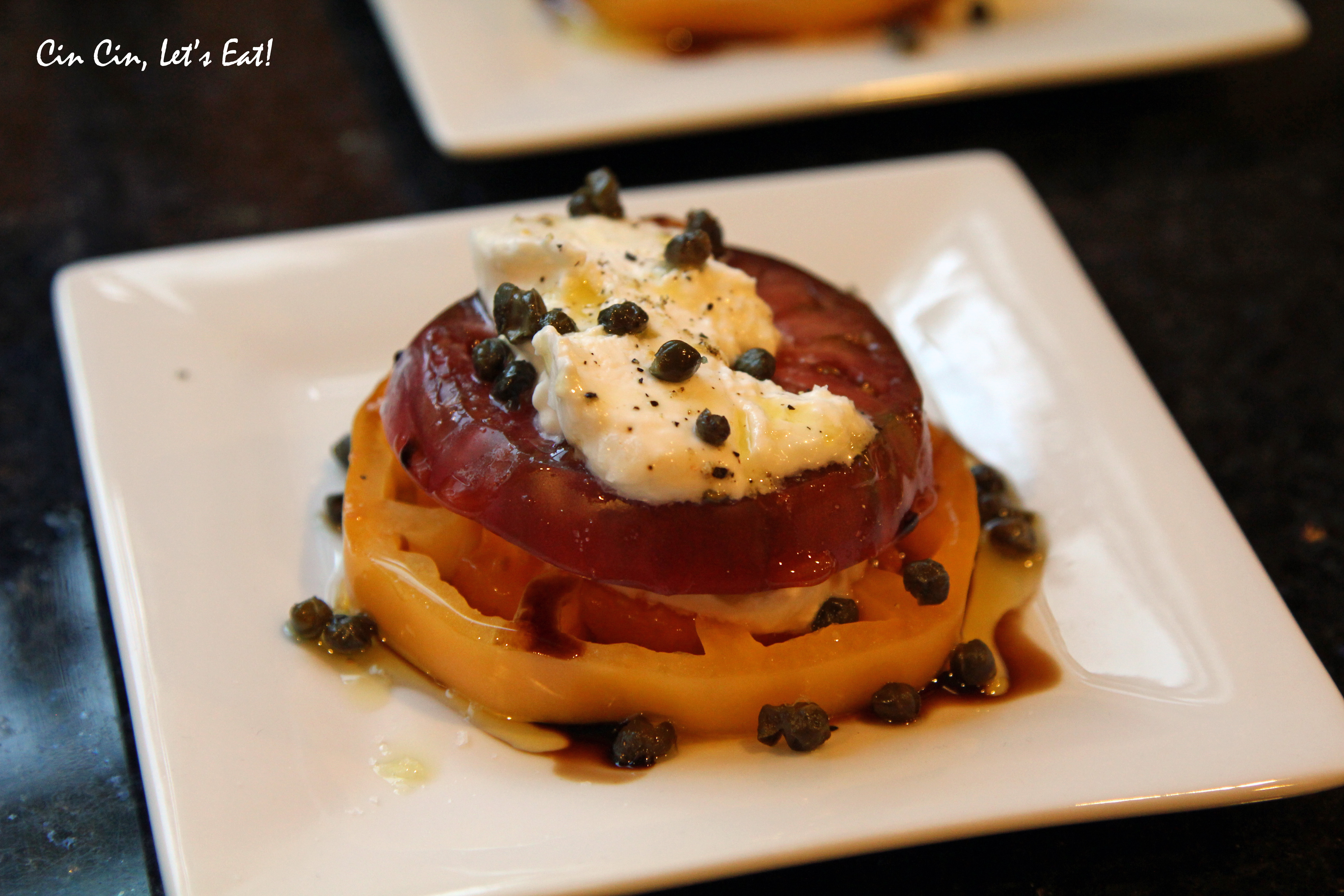Yes, I’m still sticking with the farewell to Summer theme here. Beautiful heirloom tomatoes are all over the farmers market right now but not for long, so I gotta enjoy them while they last! A couple weeks ago, I had a fabulous meal consists of small bites at James Randall in Los Gatos, California. There were boneless fried chicken with bacon waffle, gnocchi with pancetta in garlic cream, charcuterie plate, and this amazing heirloom tomato stack with burrata cheese and fried capers. It made such an impression, I knew I must recreate it.