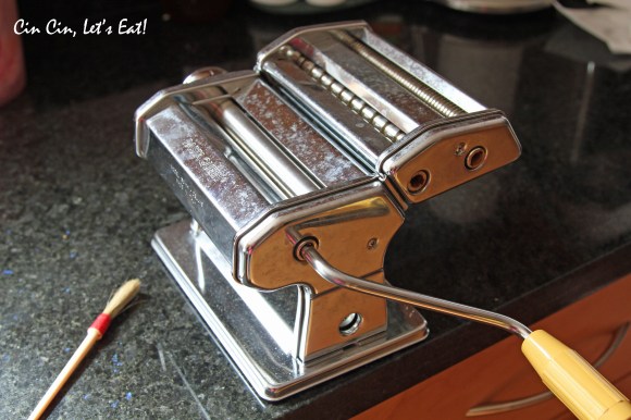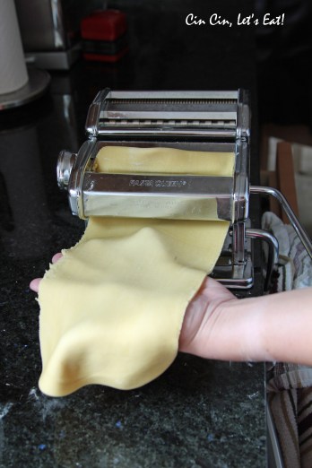 2. Once the dough goes through the machine, fold it in half, dust it with flour, and roll it a couple more times.