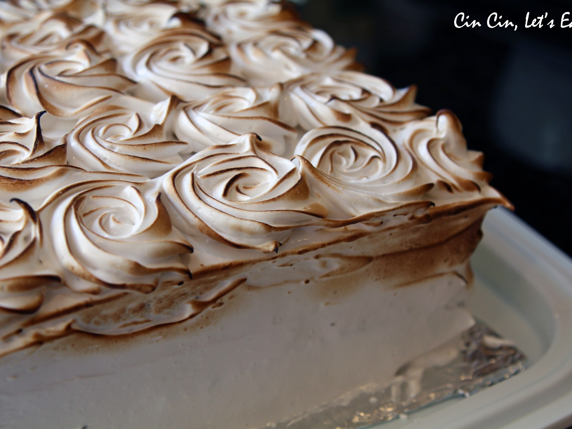 I used Betty Crocker SuperMoist cake mix. For this particular cake, I used one box of chocolate fudge and one box of vanilla, each yields one 13×9 size cake. To assemble – Chocolate cake on the bottom, a layer of strawberry mousse, then top with the vanilla cake. Frost with marshmallow frosting, pipe the roses on the top with a Wilton 2D tip (awesome tutorial here and here), brown with a culinary torch, and voila! You can certainly skip the rose decorations, the coolest part with the marshmallow frosting is that once torched, the cake will look awesome no matter how messy you frosted the cake. Keep the cake refrigerated until you are ready to serve.