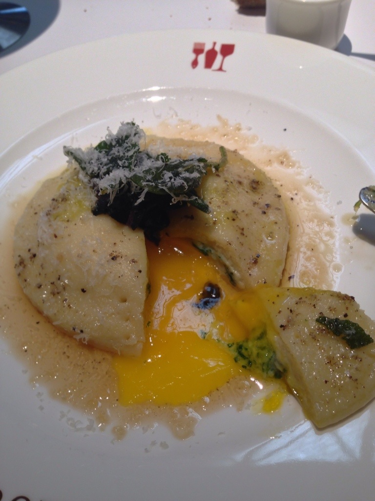 Here it is!! As perfect as I imagined it would be. The idea here was to mix the runny egg yolk with the browned sage butter and make a thick sauce for the raviolo.