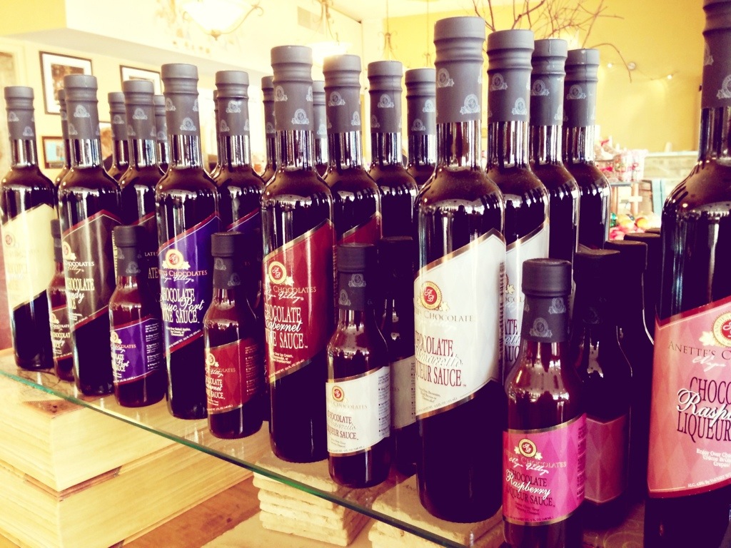 Bottles of chocolate liqueur and chocolate wine sauce. Liquid goodness!