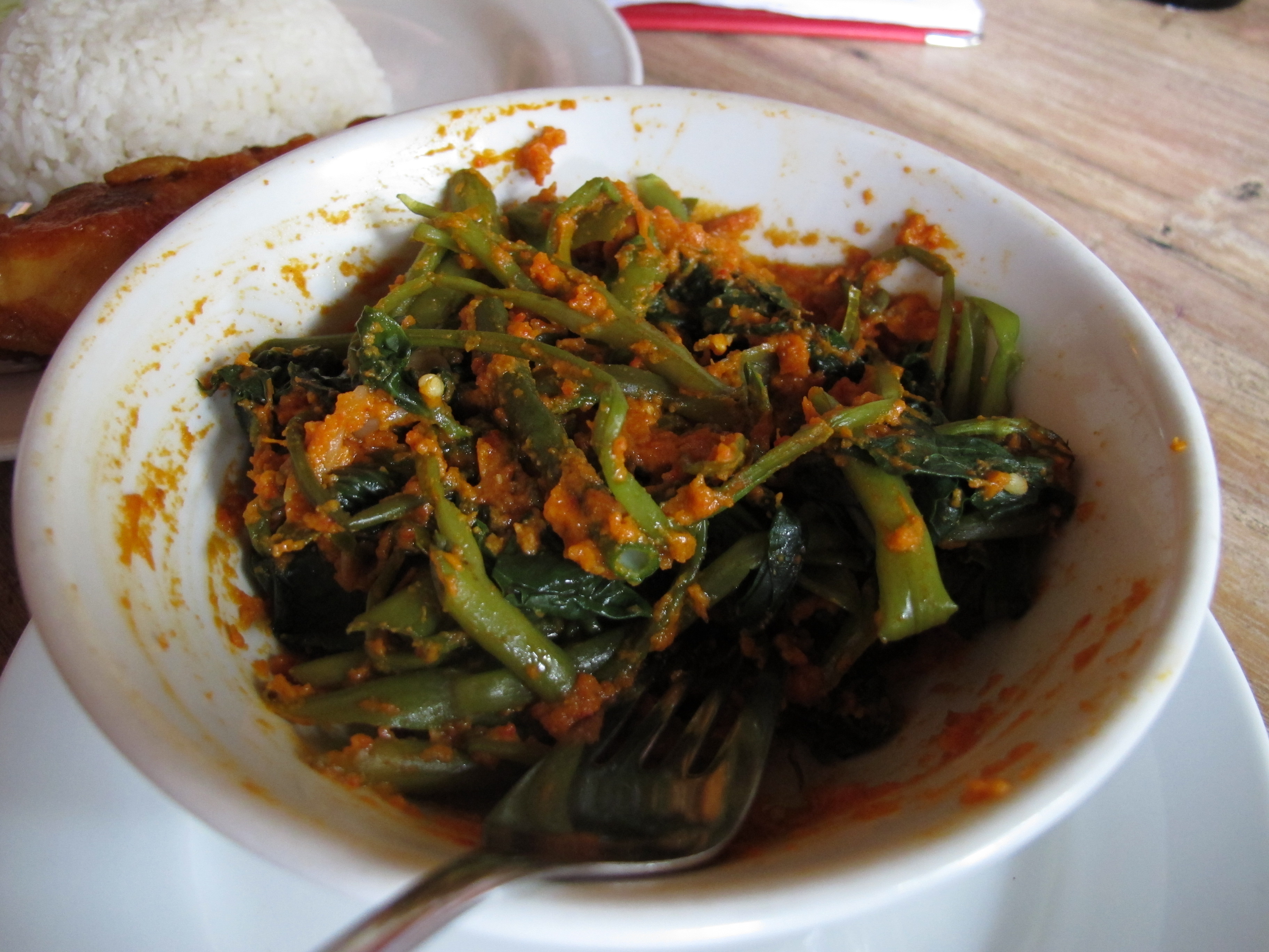We had lunch at Warung Ocha (Jalan Raya Seminyak no 52 Kuta Badung). Now this is what we all wanted, just a small local joint that served up authentic and inexpensive food. We had our first of many smoothies and juices here, the green drink I got was called “the Sicko”, and has banana, orange, and spirulina. We also ordered some Kangkung (water spinach) with chili that’s always been my favorite but nonexistent in Western cuisine. I ordered Ayam Goreng with Lodeh for lunch – fried chicken, tofu, vegetable, with rice and sambal sauce.
