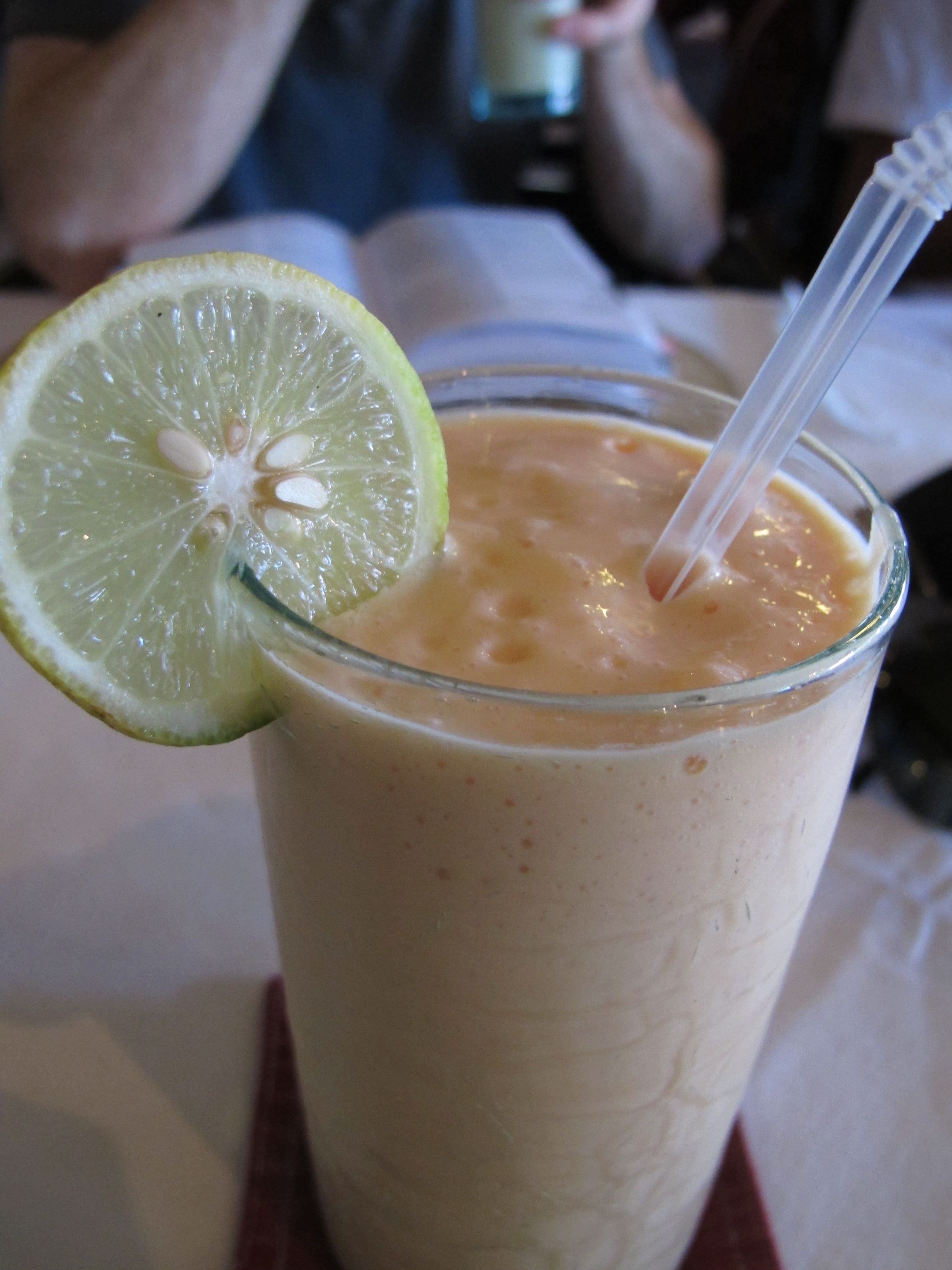 Papaya milk shake! And I chose 6 small items for my lunch – seafood satays (with lemongrass as skewers), spring rolls, kangkung (water spinach), ikan pepes (fish in banana leaves), tempes (fried soybeans with palm sugar and chili, this was one of my favorite dishes to get), beef rendang.