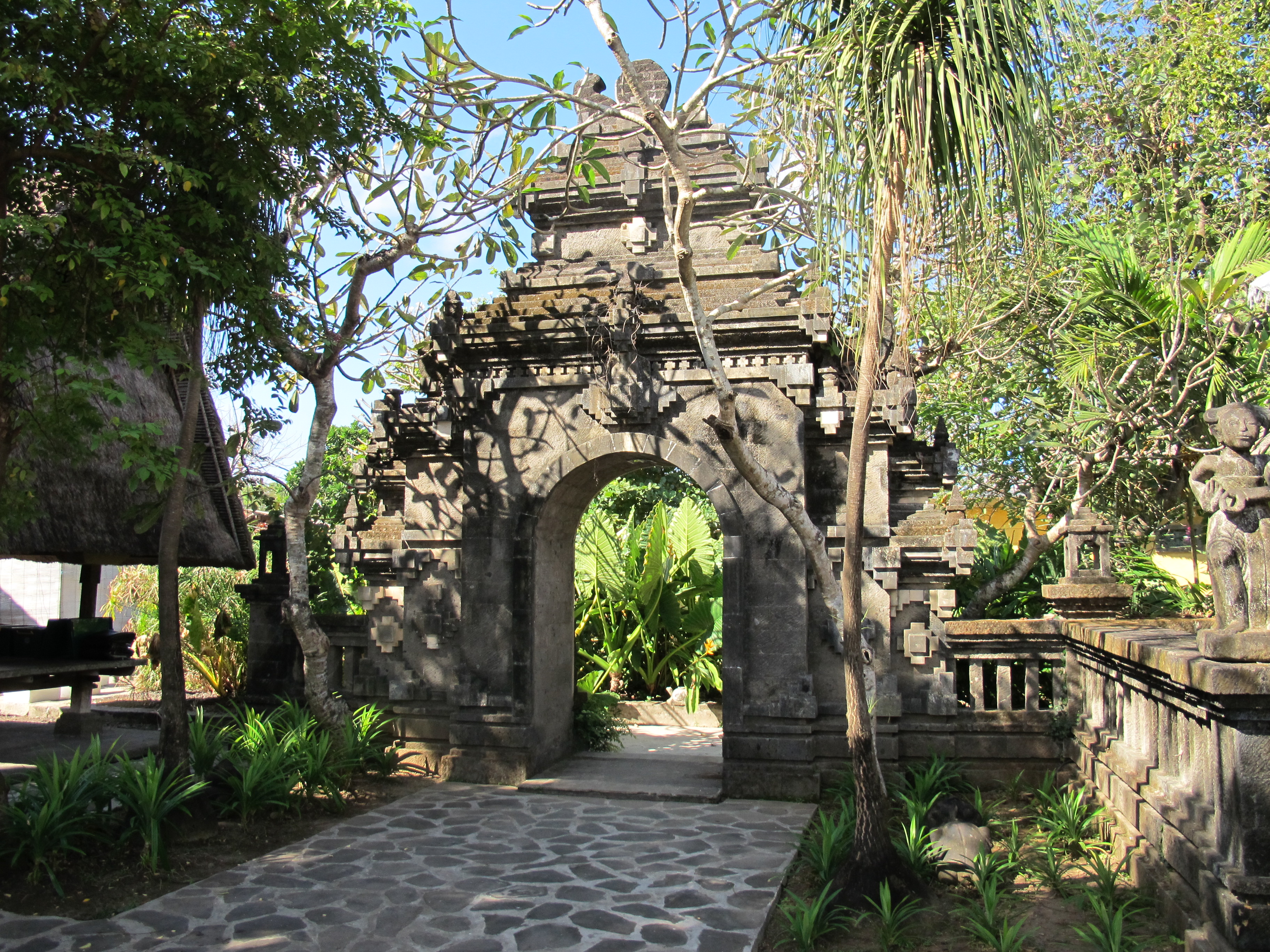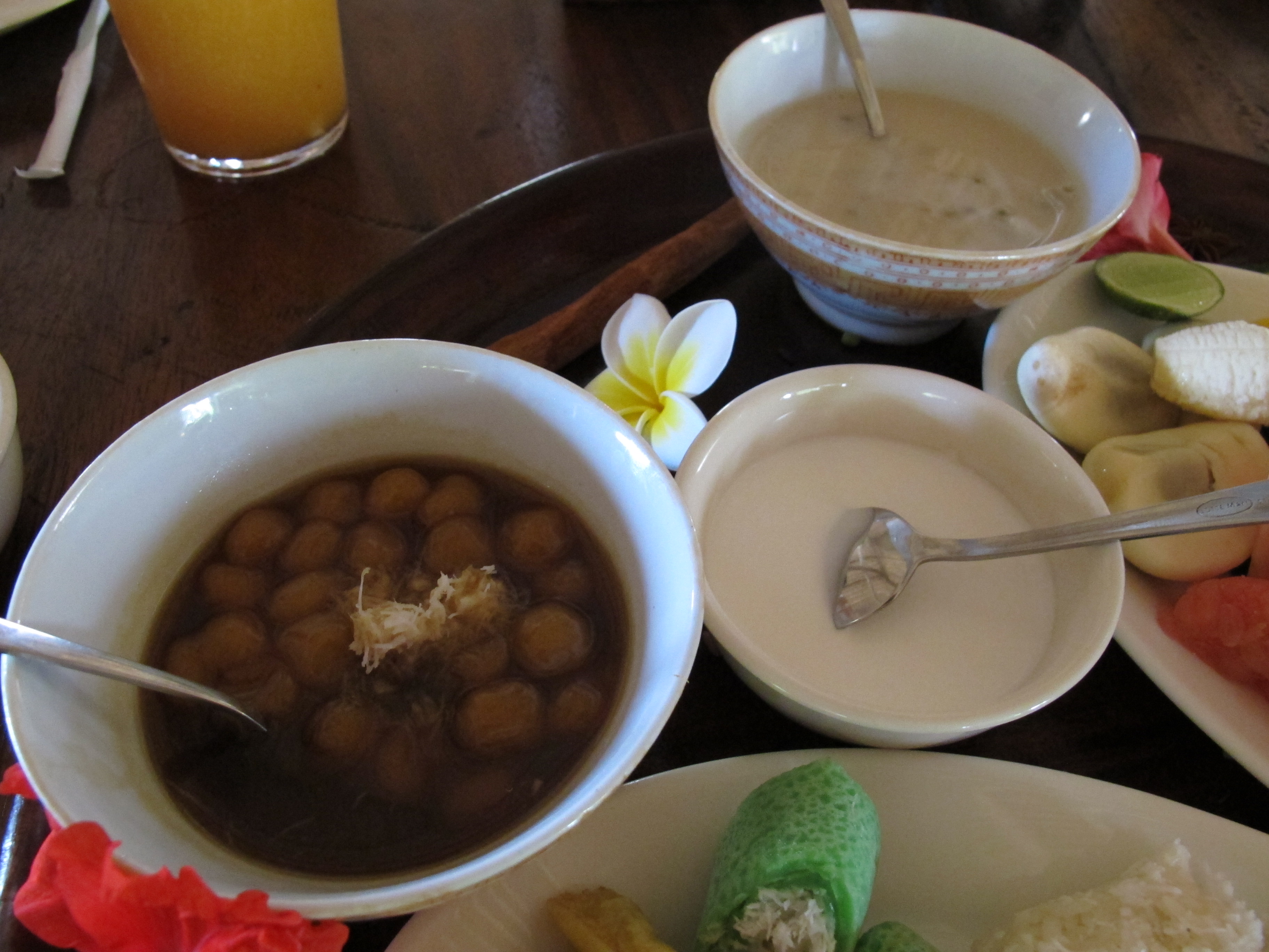 After a tour of the grounds, we sat down and enjoyed a traditional Balinese breakfast that consisted of the cakes and fruits we saw at the market, black rice pudding, and sweet rice dumplings in a sweetened coconut cream sauce. We washed all those down with Balinese coffee and refreshing papaya orange mango smoothie.