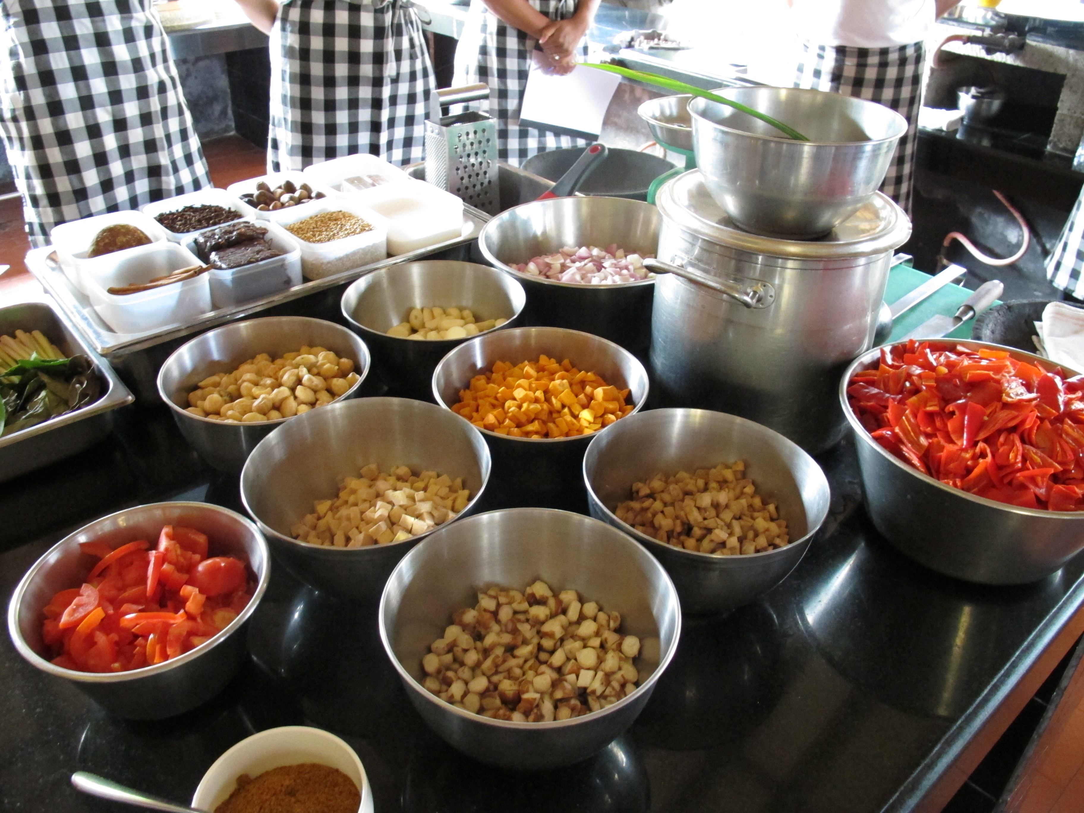 After a somewhat depressing trip to the fish market, we head to Rumah Bali to commence our cooking class. First, we had a quick tour of the gorgeous grounds and facility. It’s a stunning 24-room bed and breakfast with a beautiful garden setting. Would’ve loved to stay there!