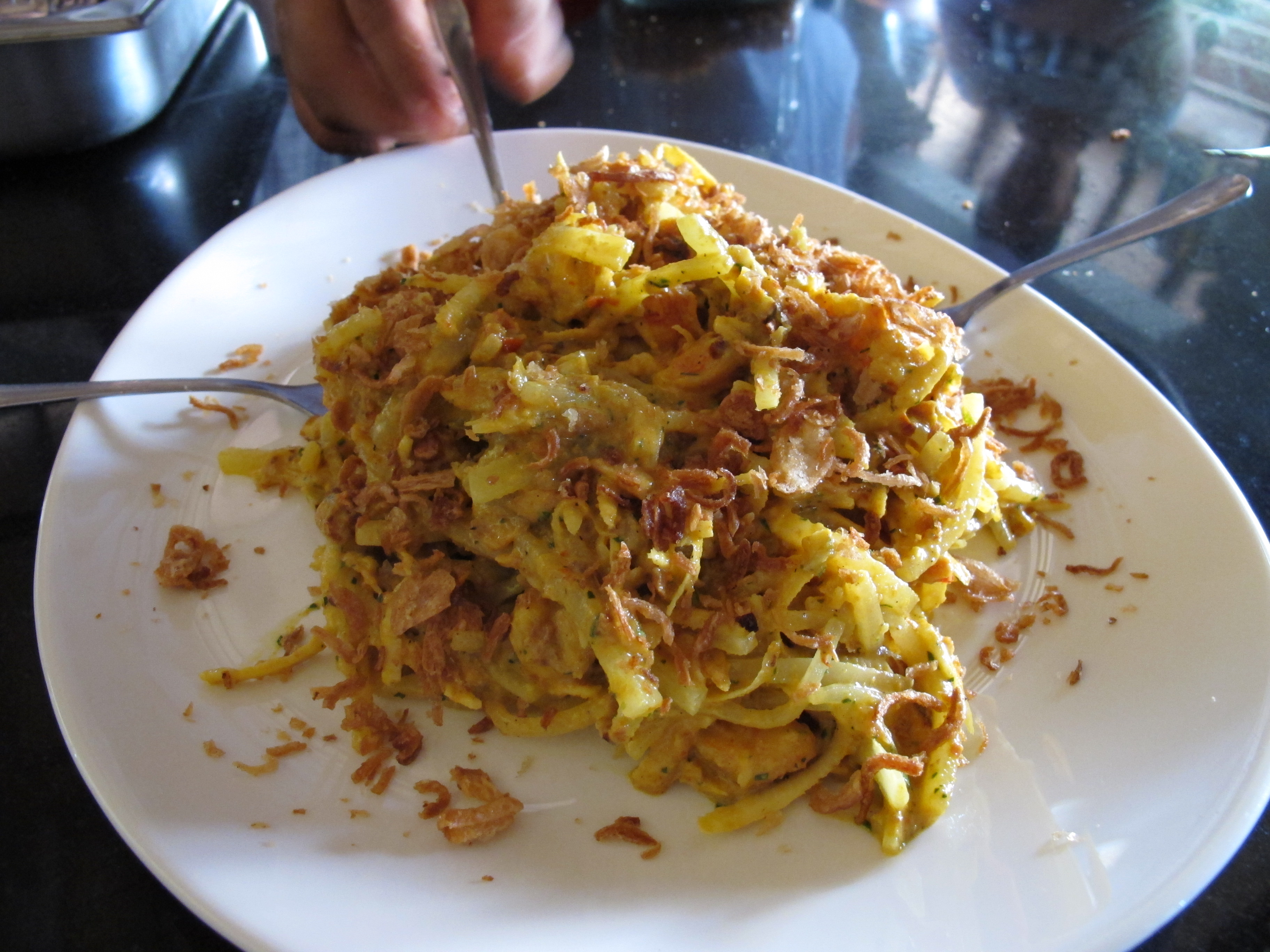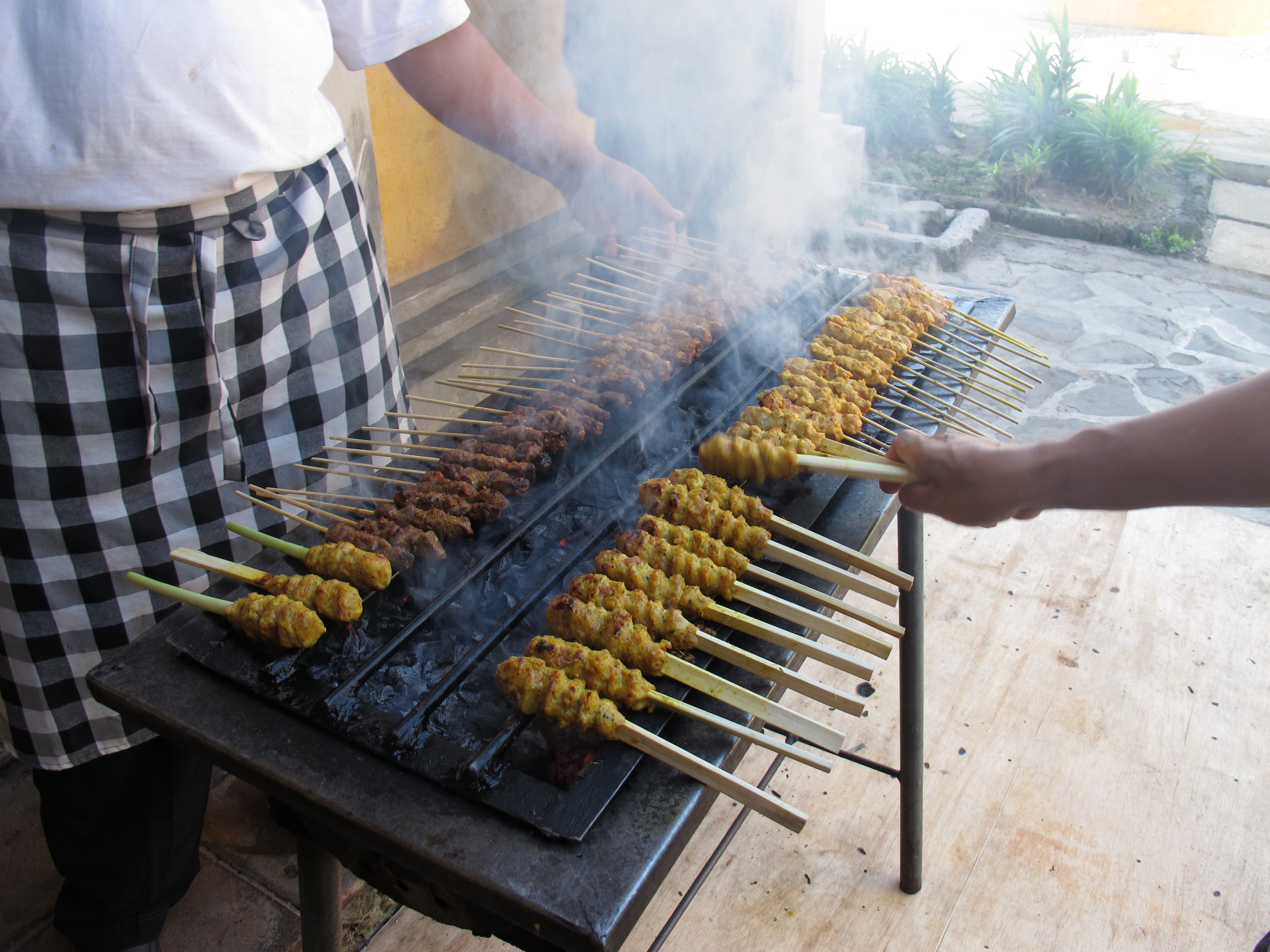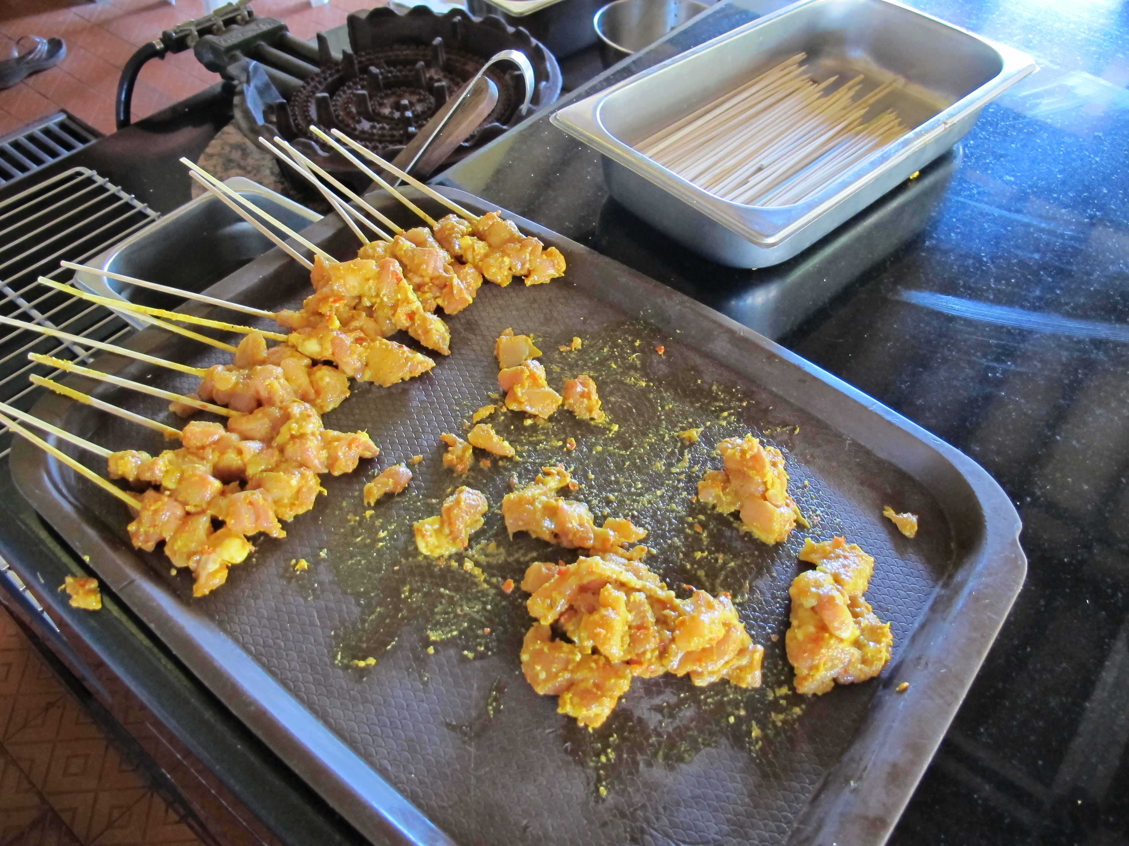 |Below| Nasi Goreng Mawut, a combination of fried rice and noodles. This was cooked with the freshly made coconut oil, and oh my goodness, was it delicious! On the right, seafood satays! The special spiral shapes were very hard to make.