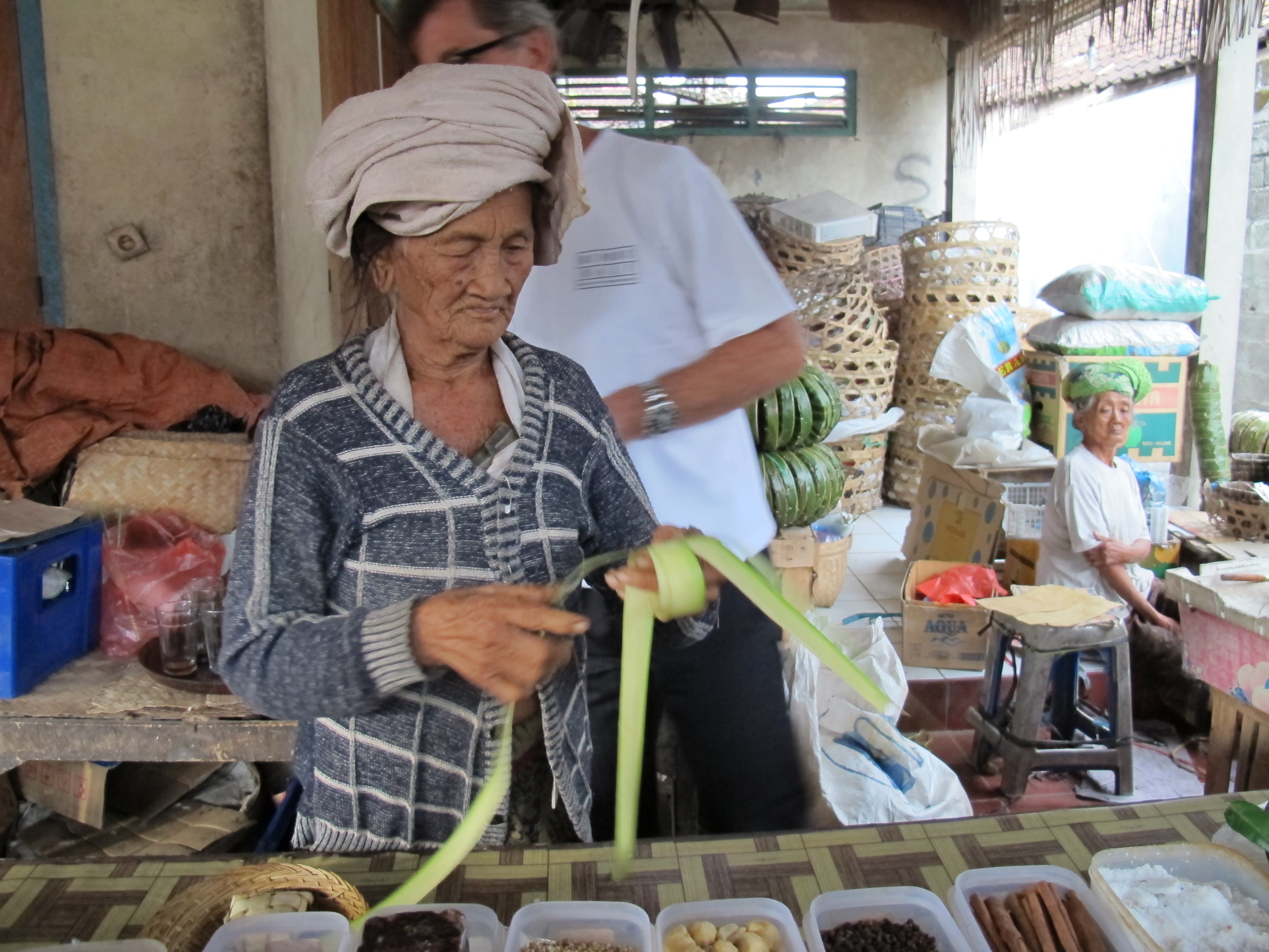 |Below| Mama Bali making a 1-minute basket with palm leaves. Usually these are filled with rice then steamed.