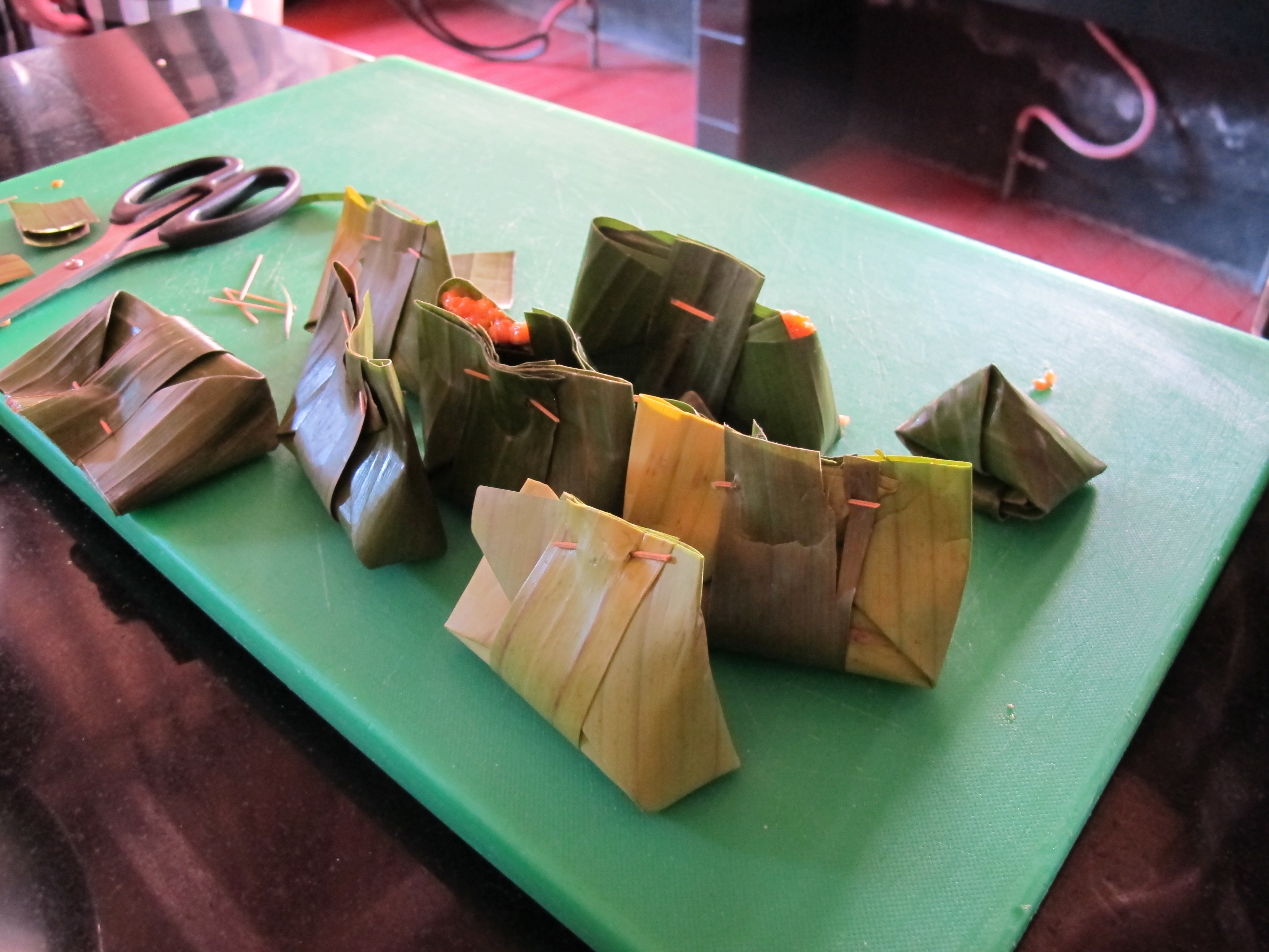 |Below| One of my favorite dish from the class, green papaya salad with prawns and dressing. On the right, making little packages wrapped with banana leaves. These were stuffed with a minced chicken mixture. Other variations include minced seafood or sweet cakes. With each varieties, the wrapping is also done differently.