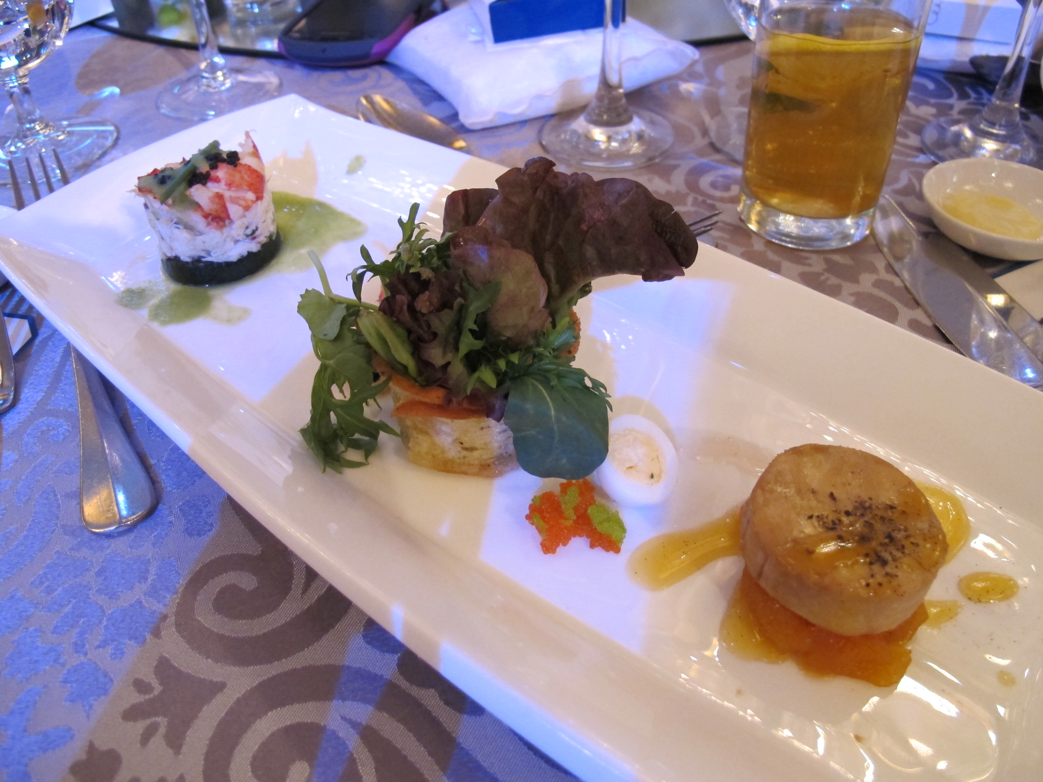 First course: trio of lobster, salad, and foie gras in caviar sauce.