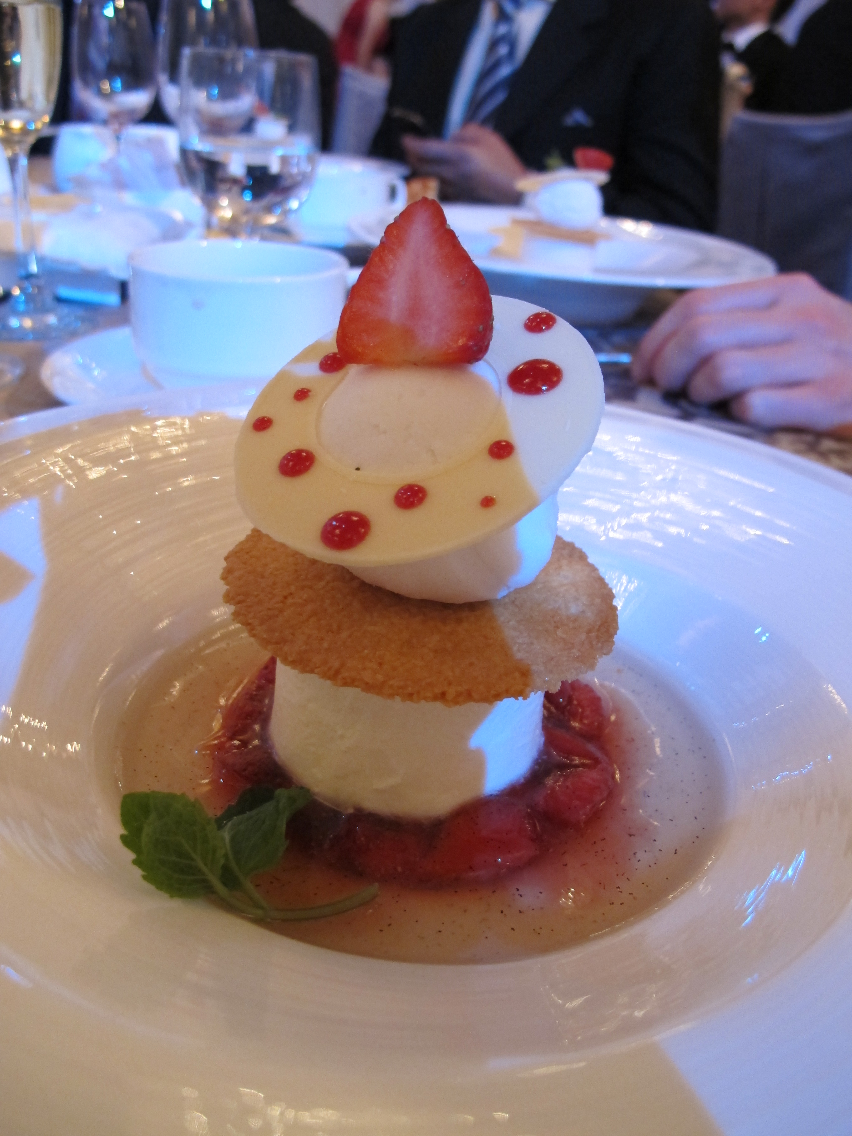 Dessert: coconut blancmange with strawberry, and chocolates.