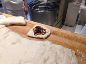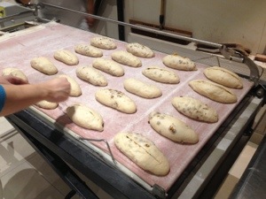 Below, making the whole wheat batards. We added dried apples, raisins, and walnuts to the dough.